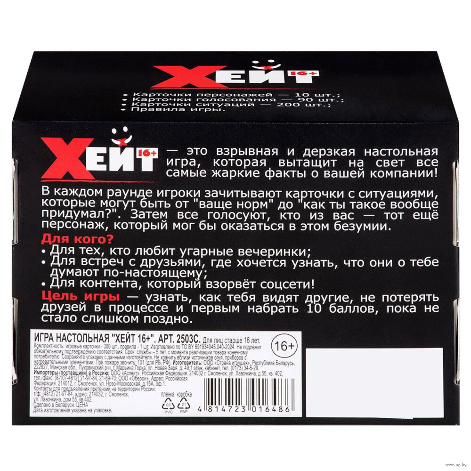 Размер упаковки: 9 x 6 x 13 см. tnved: 9504908000 Температурное ограничение: Нет Жанр игры: Карточная Количество игроков: 3 - 10 игроков | ||