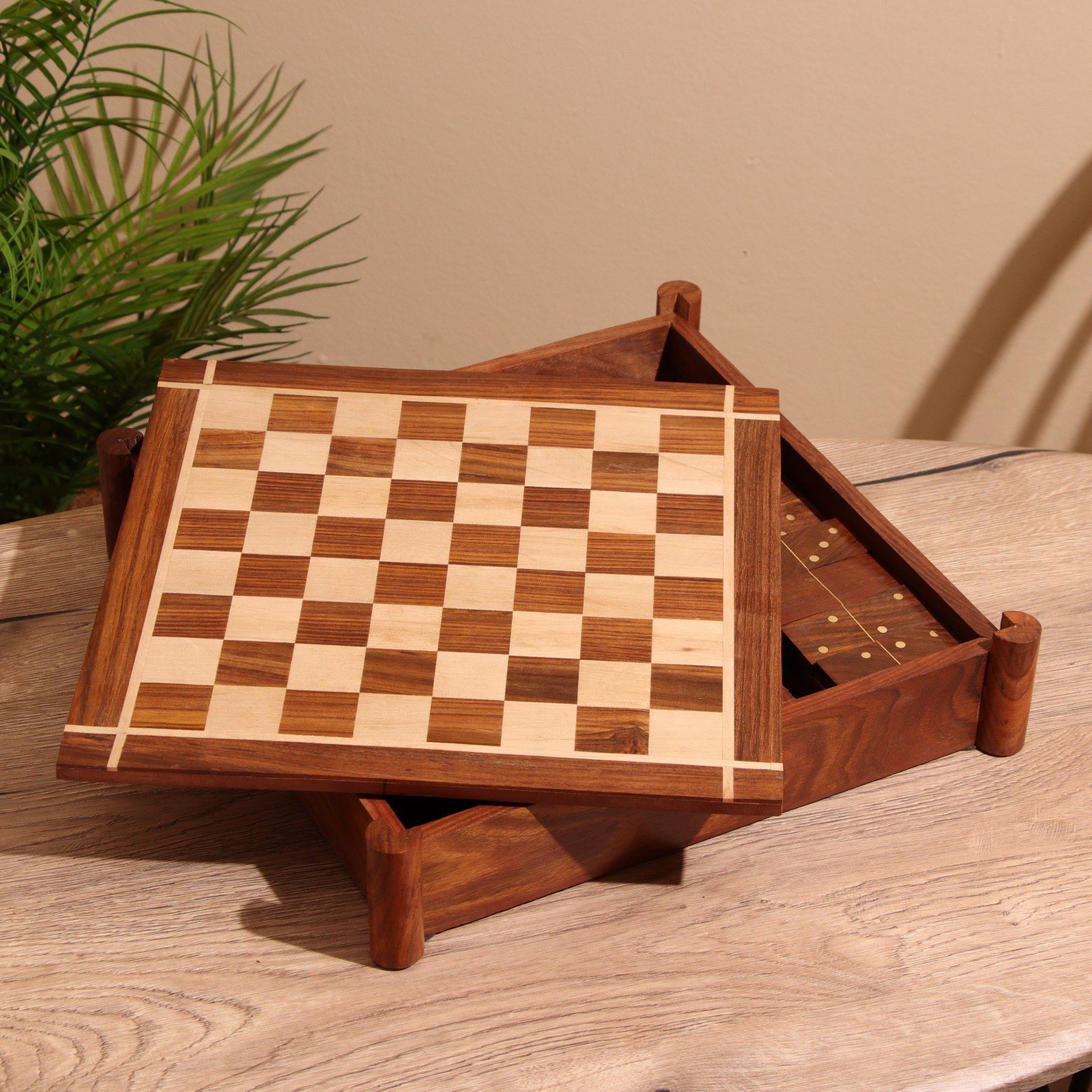 Игра настольная 3 в 1, шахматы, домино, кубики, доска 35x35 см, дерево шишам, 35.5x35.5x7 см., Индия