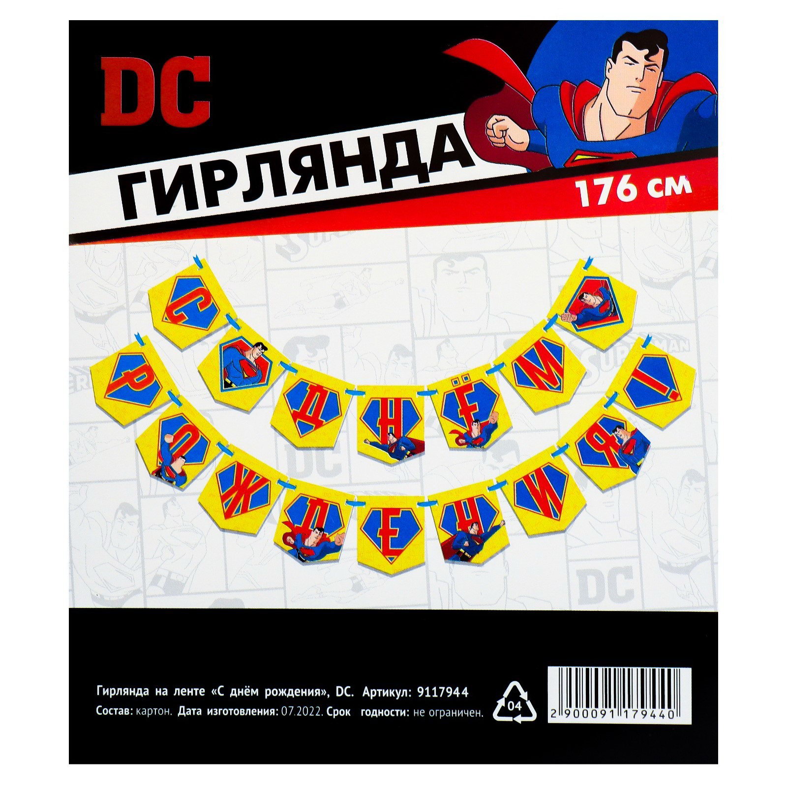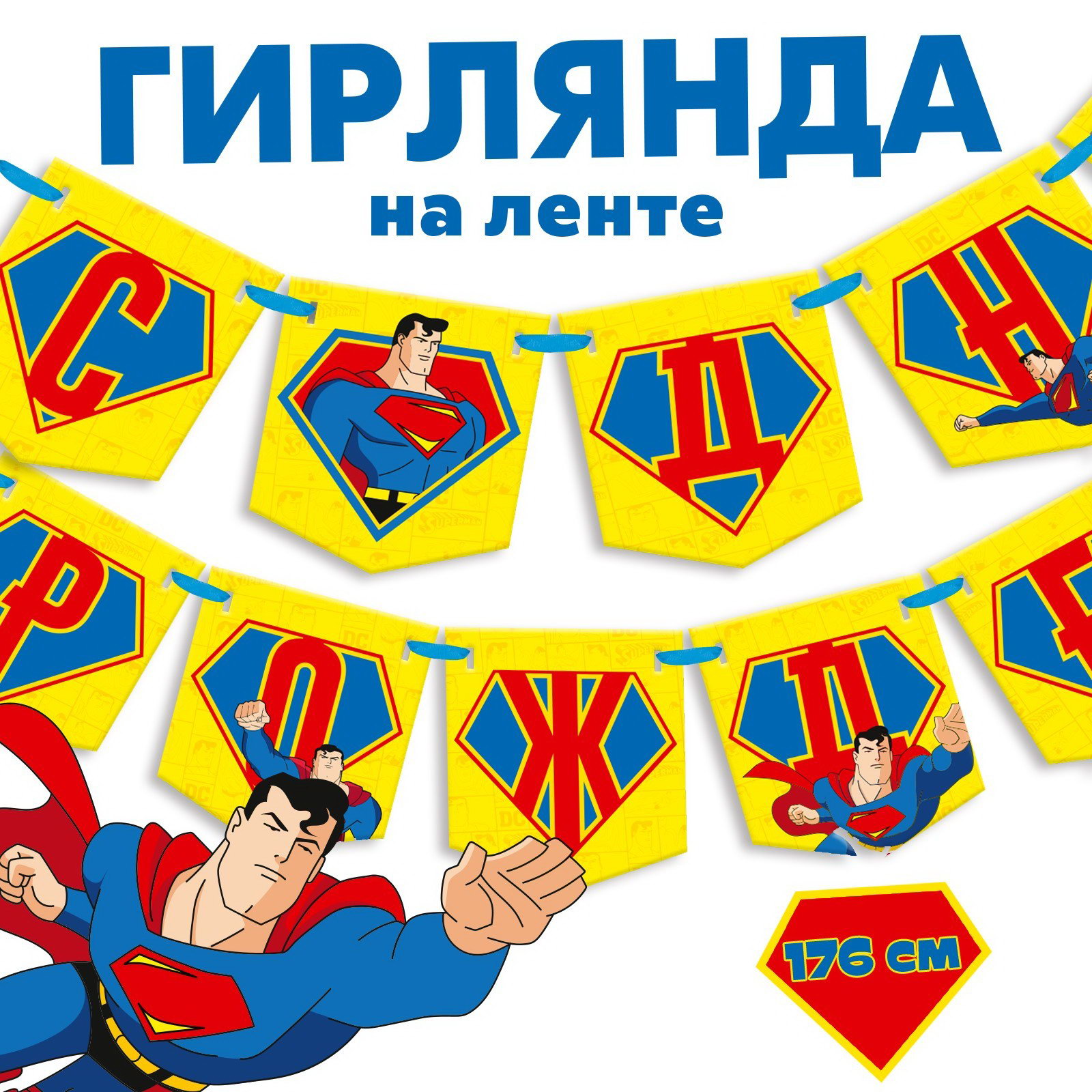 Гирлянда на ленте "С днем рождения", длина 176 см, Супергерой, 0.5x14x14 см., Страна Карнавалия, Россия