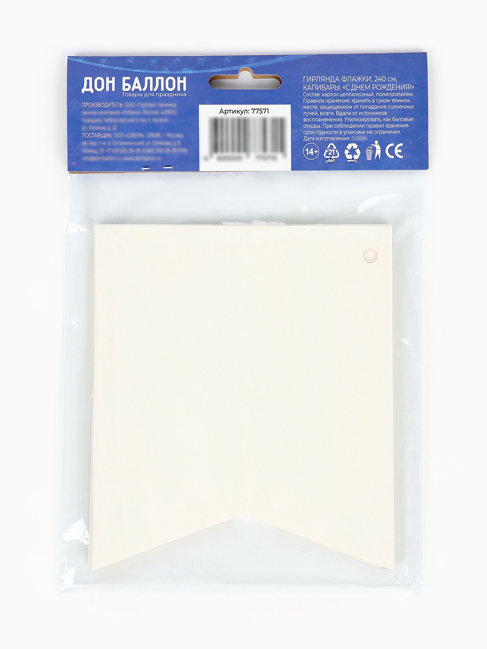 Размер упаковки: 15 x 0.8 x 22 см. tnved: 9505109000 Температурное ограничение: Нет Возраст: Детский Тематика праздника: День рождения Набор: Нет Вид: Гирлянды, растяжки Цвет: Разноцветный | ||