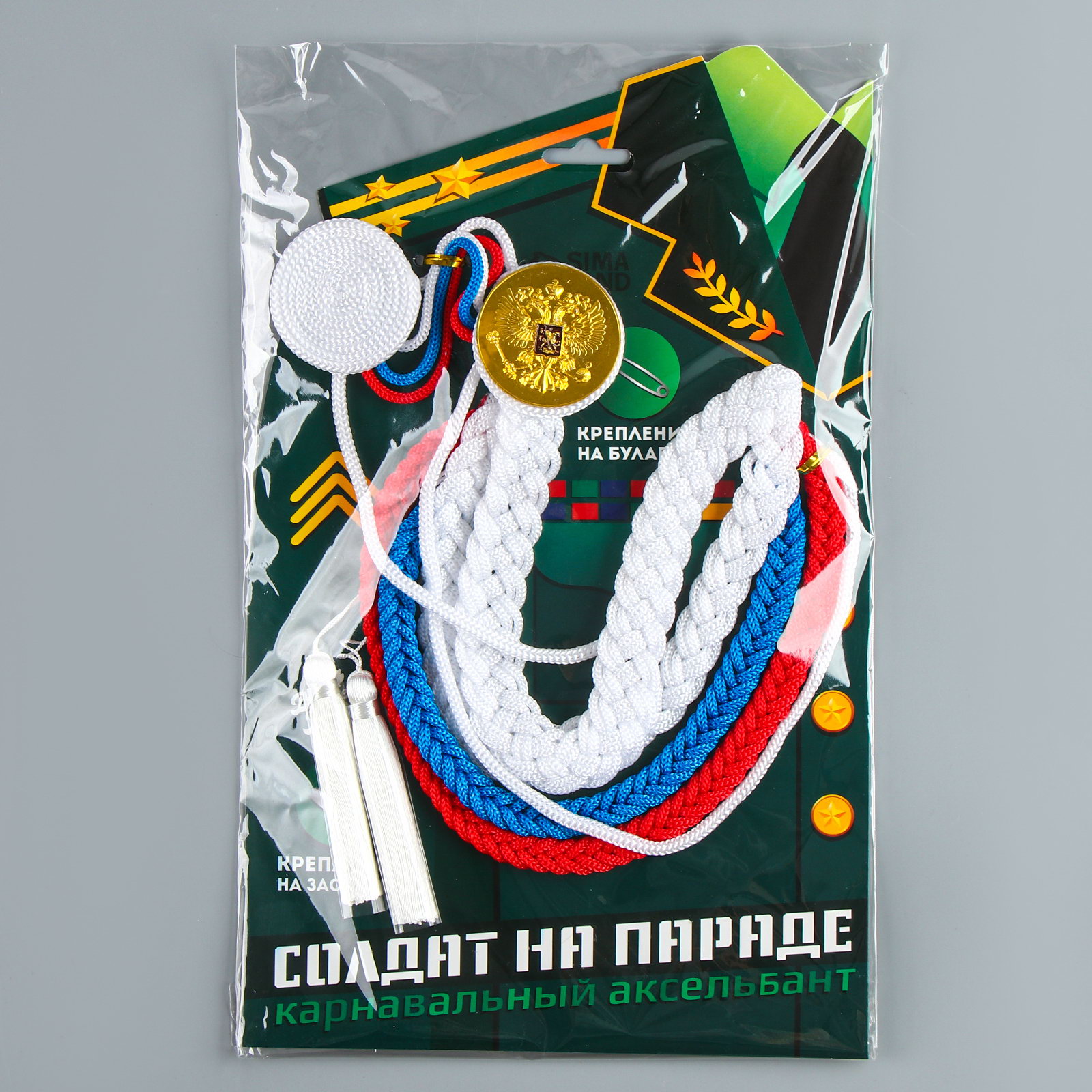 Тематика: 9 мая, Военные Размер упаковки: 31 x 2 x 34 см. Персонажи: Солдат Вид: Аксельбант Тематики праздника: День Победы (9 мая) tnved: 7117190000 Яркий и стильный аксельбант незаменимый аксессуар для создания образа солдата на параде. Этот элемент костюма поможет вам погрузиться в атмосферу праздника и почувствовать себя настоящим защитником Родины. Особенности аксельбанта
