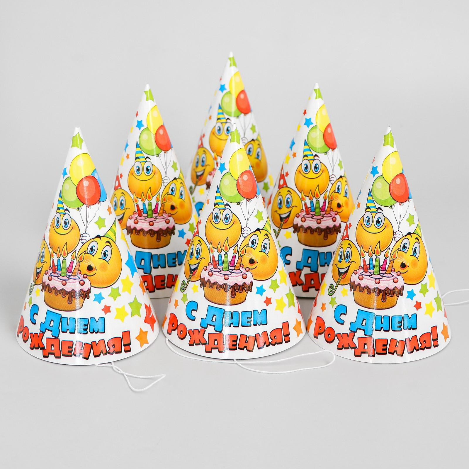 Колпак бумажный "С днём рождения", набор 6 шт., 16 см, 10.5x10.5x16 см., Страна Карнавалия, Россия