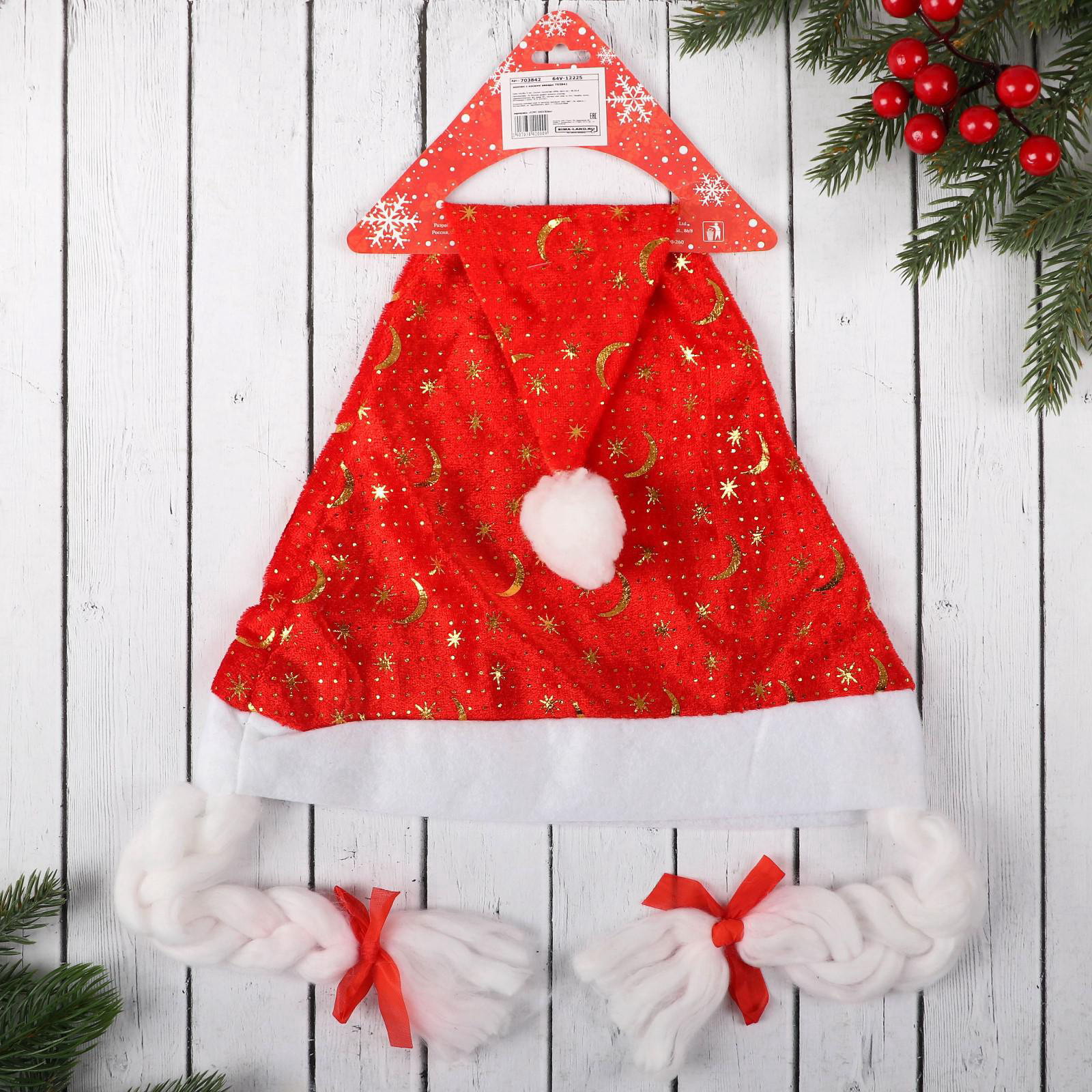 Колпак новогодний "Звёзды" с косами, красный, 27x38 см., Зимнее волшебство, Китай
