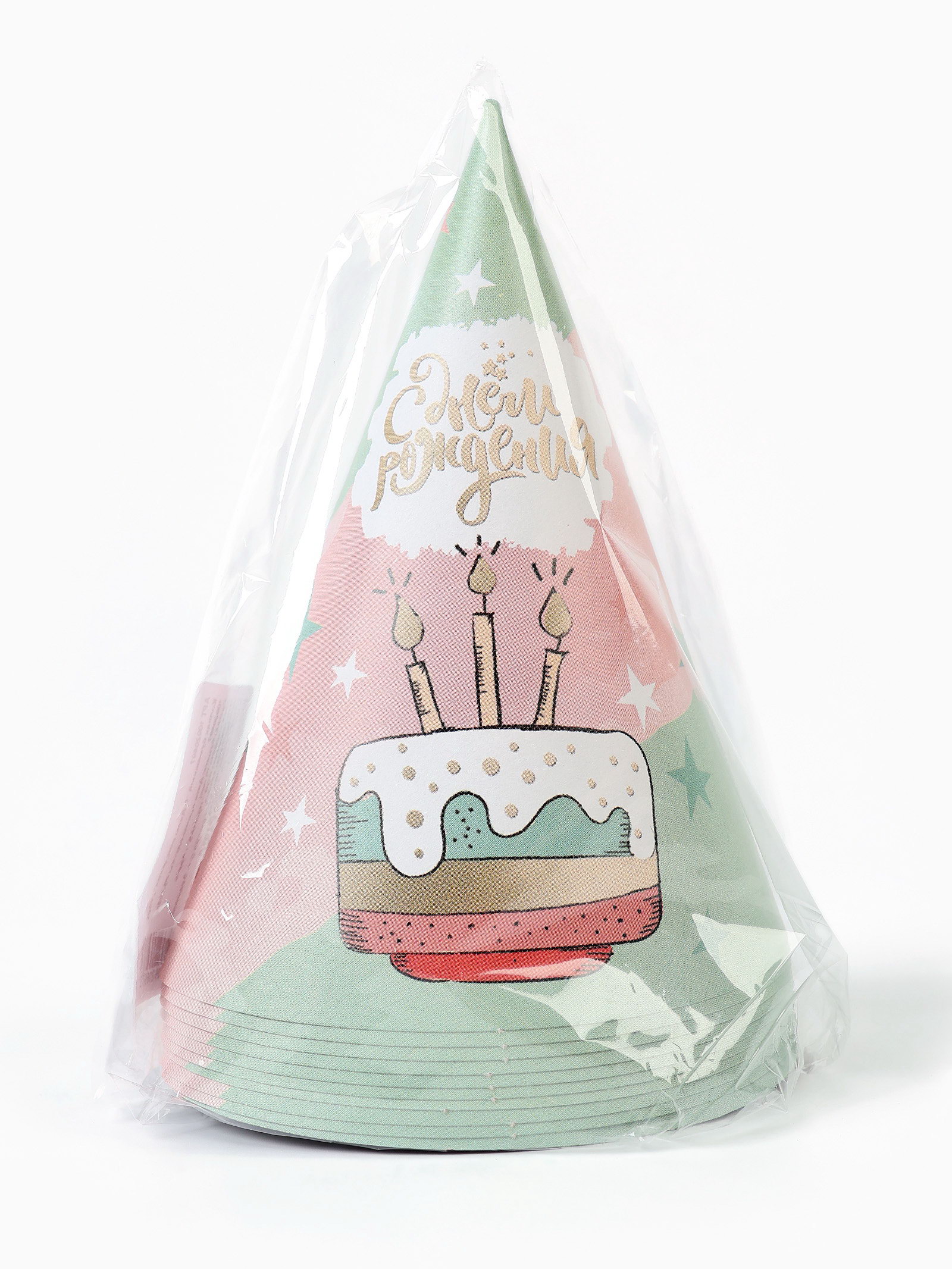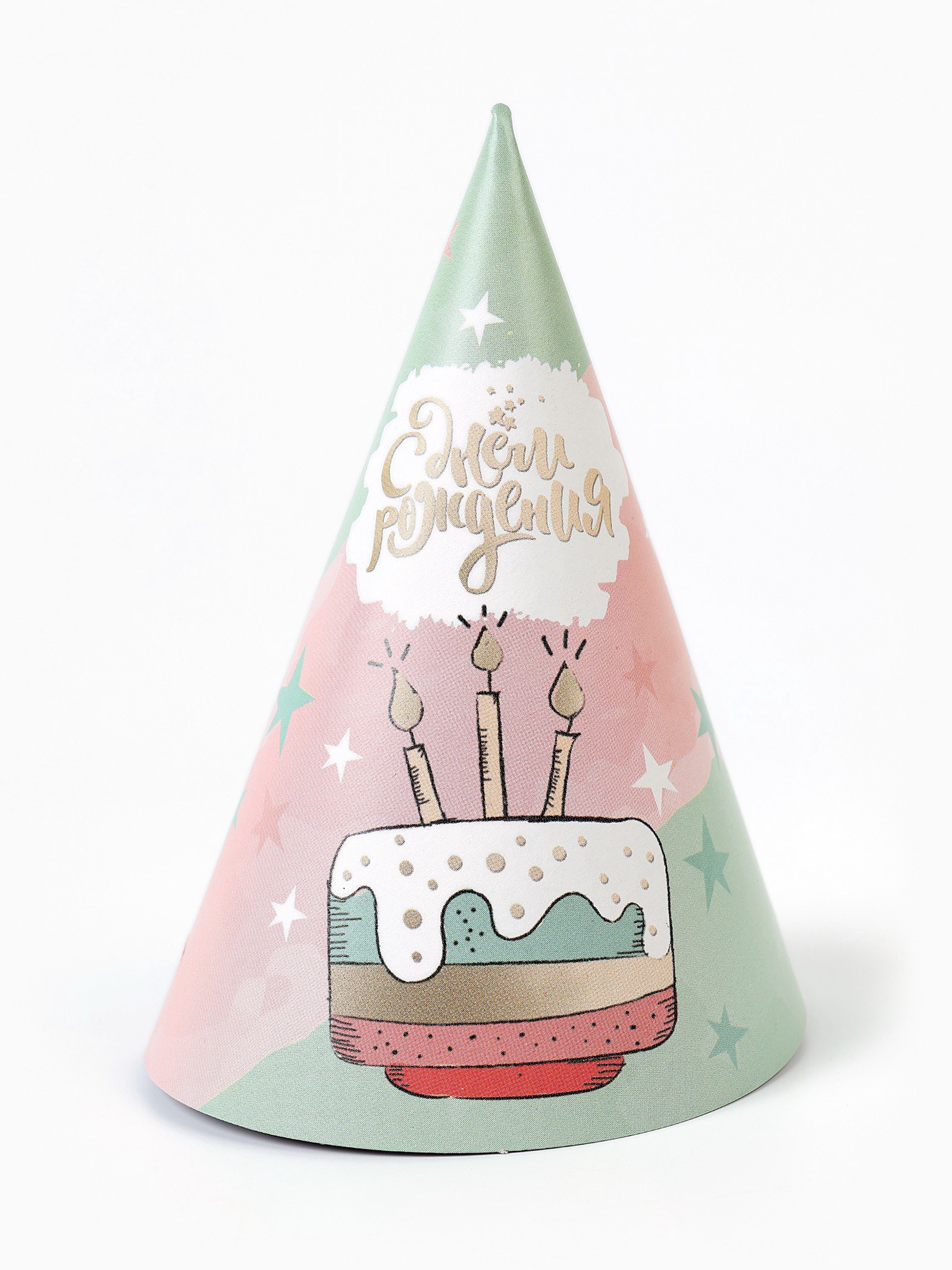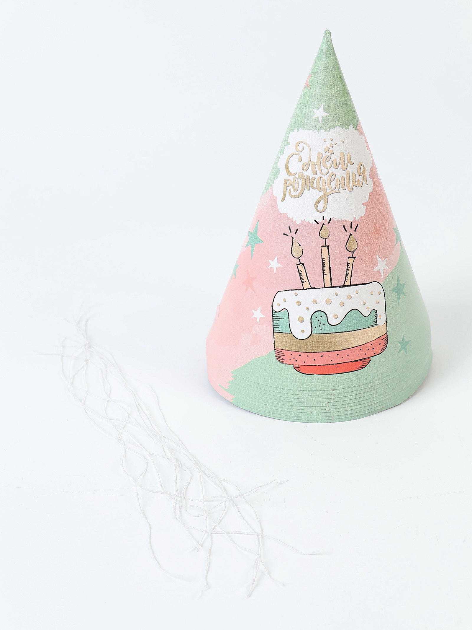 Колпак праздничный бумажный "С Днём рождения", торт, Россия