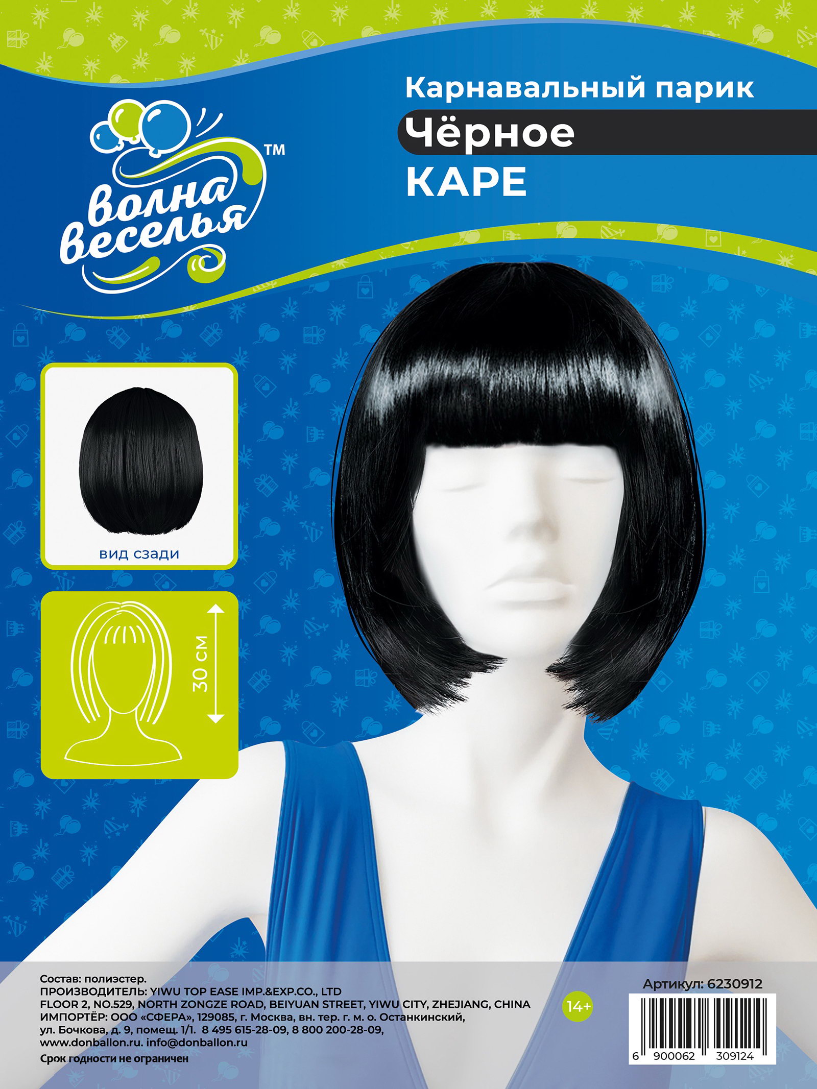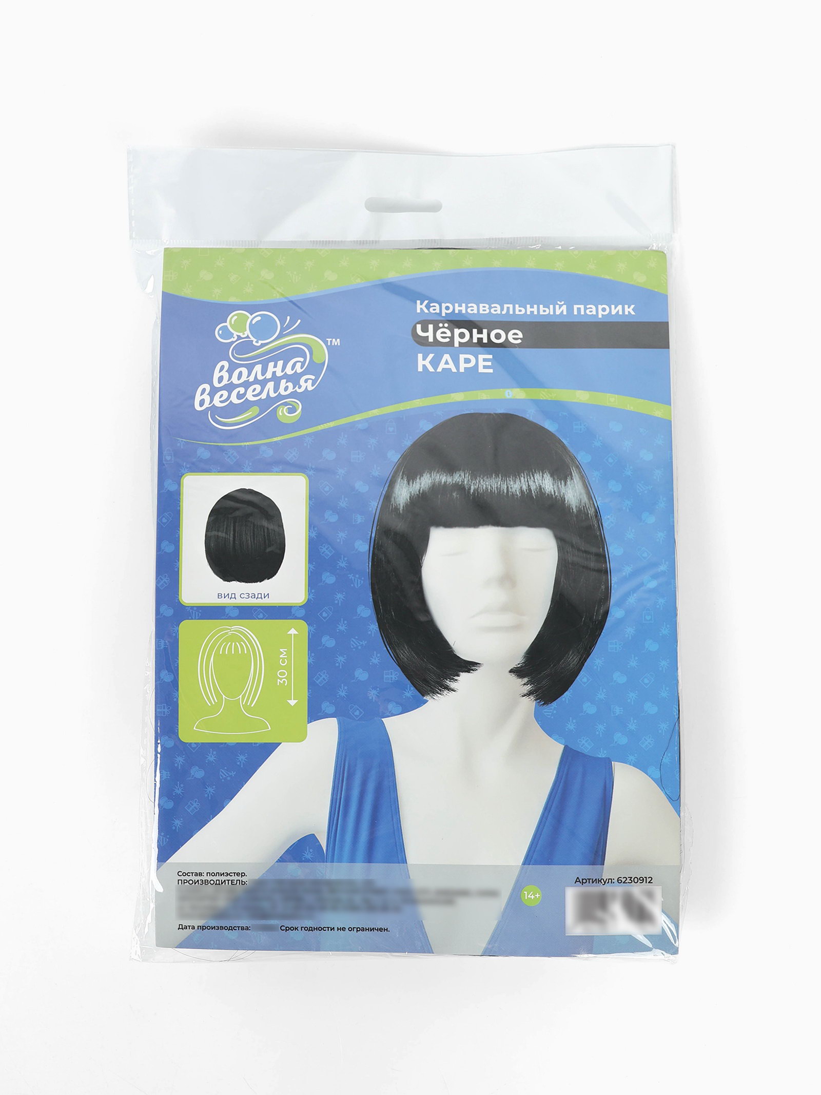 Парик карнавальный "Каре" черный, 1 шт. 110 г, Волна Веселья, Китай