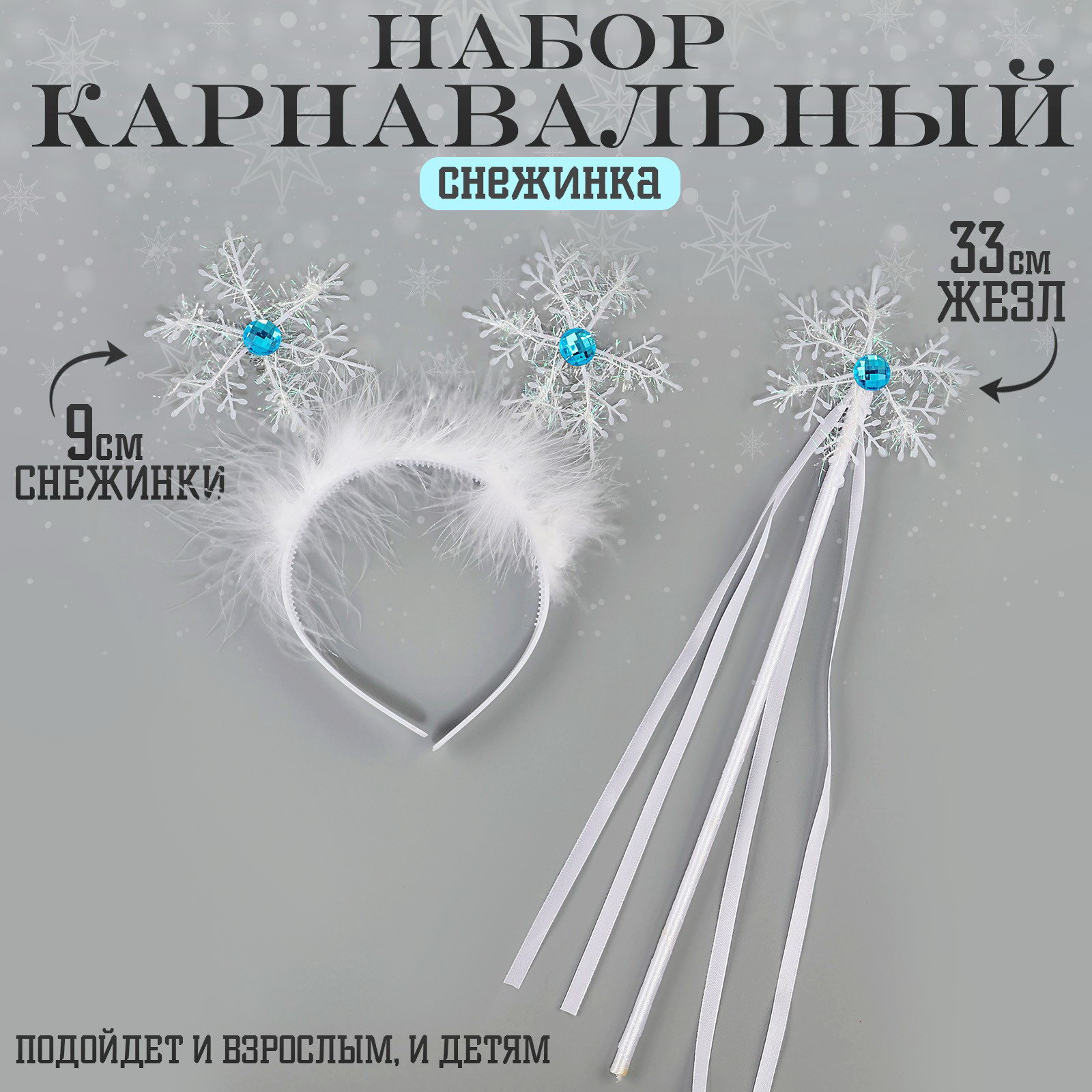 Вид: Жезлы, скипетры, Ободки Составляющие набора: Аксессуары для волос, Жезлы, палочки Размер упаковки: 20 x 40 x 2 см. Персонажи: Снежинка Тематика: Новогодние Возраст: Любой Цвет: Белый tnved: 9505900000 Карнавальный набор "Снежинка" поможет организовать чудесный новогодний образ. Украшения отлично сочетаются с костюмом Снегурочки или снежинки, его можно использовать на утренниках, тематических вечеринках, новогодних корпоративах и фотосессиях. Особенности