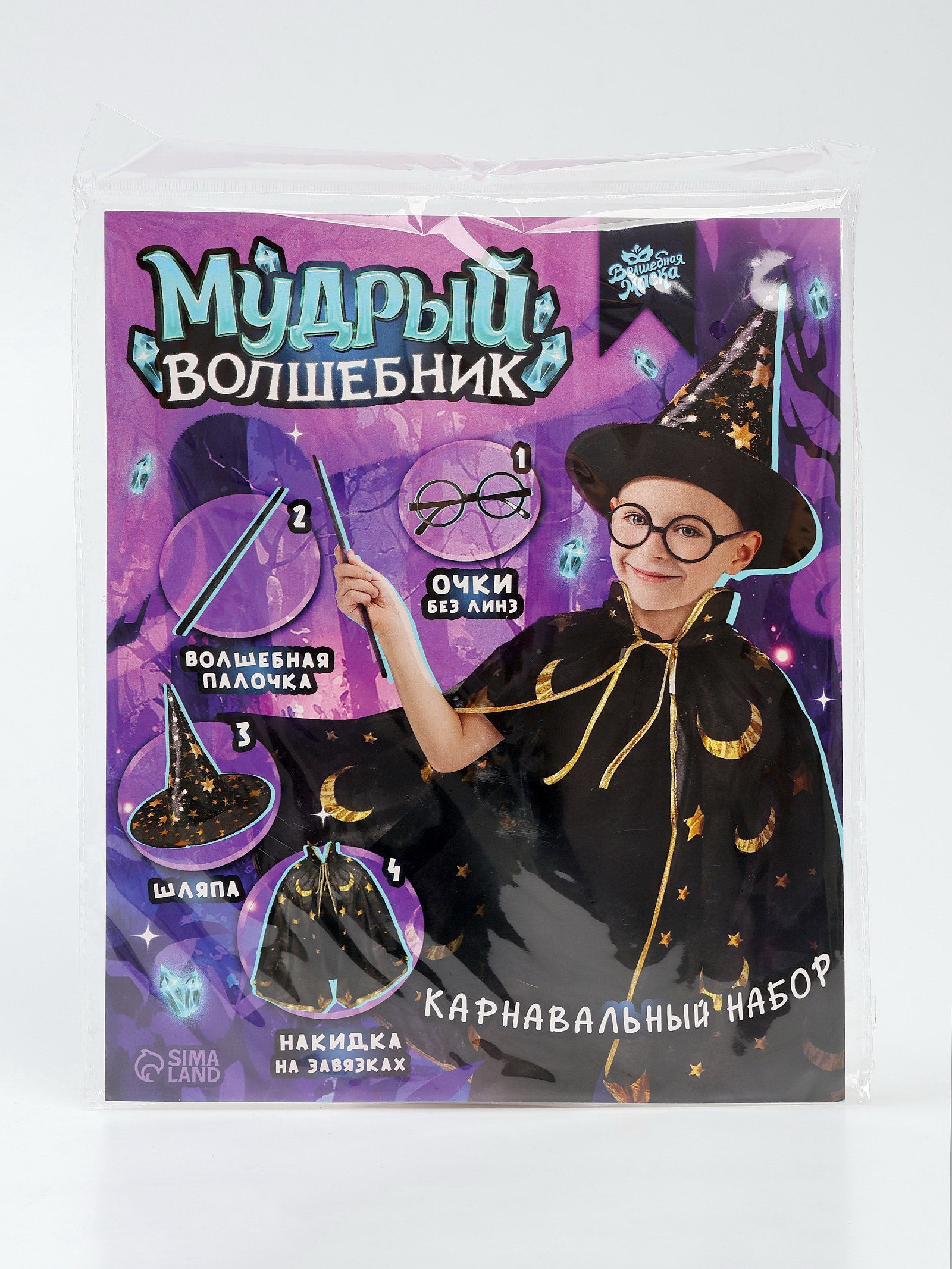 Карнавальный набор "Мудрый волшебник": плащ, шляпа, очки, палочка, 30x25x1 см., Волшебная маска, Китай