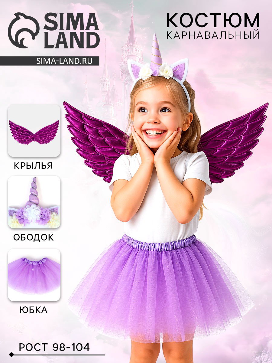 Карнавальный костюм "Нежный единорожек" юбка, ободок, крылья, фиолетовый, 28x25x2 см., Волшебная маска, Китай