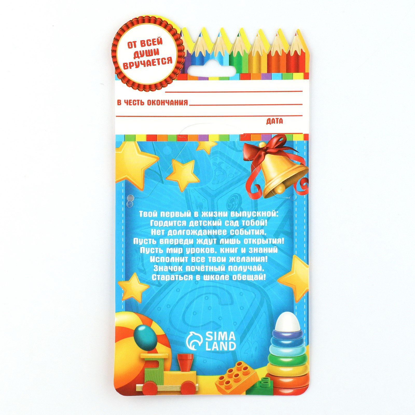 Для кого: Для девочки, Для мальчика Тематика: Детские, Поздравительные Размер упаковки: 0.5 x 17.5 x 9 см. Цвет: Синий Адресат: Выпускнику детского сада Наличие символики РФ: Нет Тематика праздника: Выпускной в детском саду Набор: Нет Набор: Нет tnved: 3926400000 Вид: Наградной набор Значок с лентой на Выпускной "Выпускник детского сада", d = 4,5 см Выпускной - это особое событие для каждого ребёнка. Сувенир изготовлен из лёгкого пластика и декорирован яркой текстильной лентой шириной 1,8 см Изделие дополнено булавкой на оборотной стороне, так что его сразу можно надеть на счастливого получателя. Каждый значок на булавке с лентой прикреплен к яркой, нарядной подложке - открытке, ребенку будет вдвойне приятно получить такой презент Диаметр значка - 4,5 см | ||