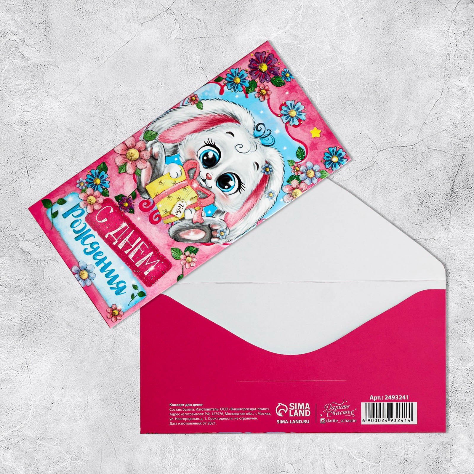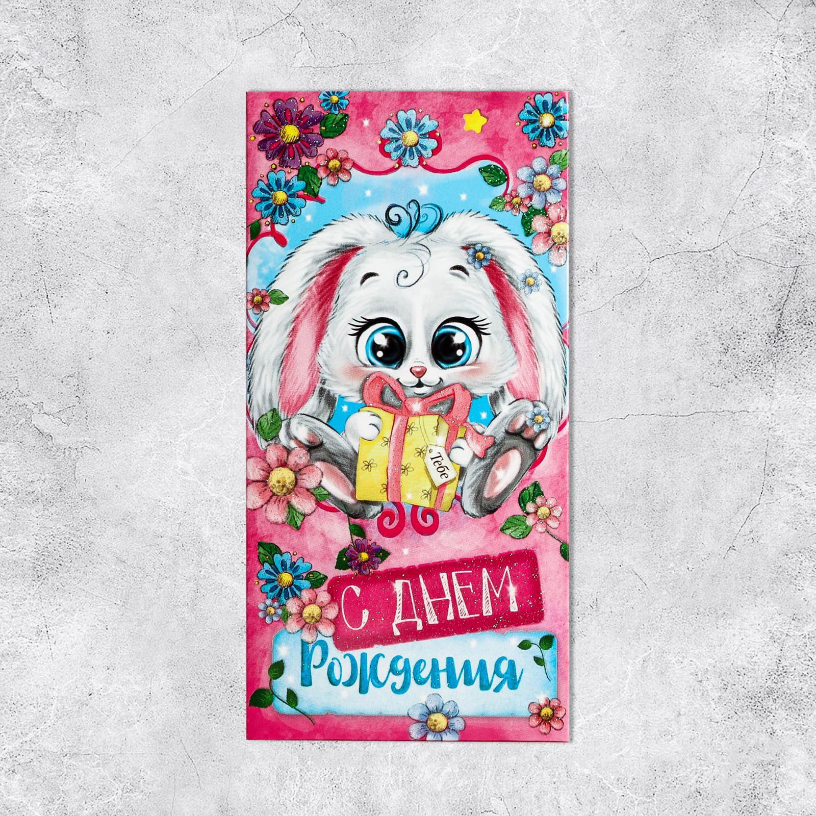 Конверт для денег "С днем рождения", милая зайка, с глиттером, 16.5 x 8см, Дарите Счастье, Россия