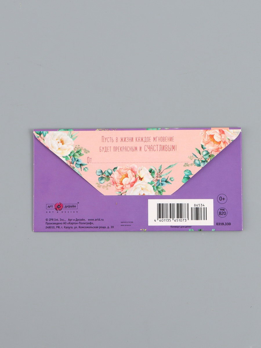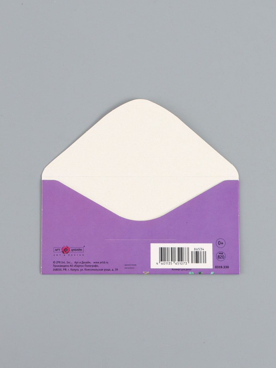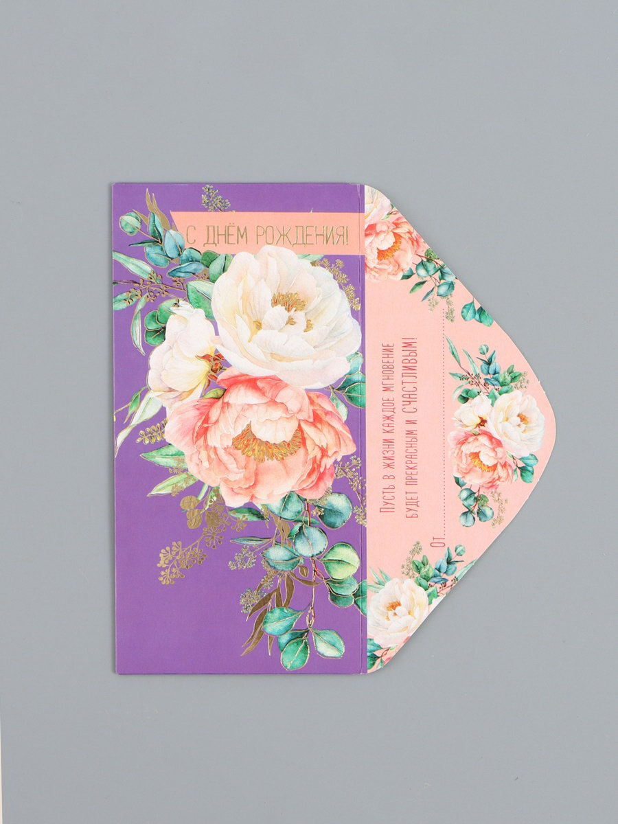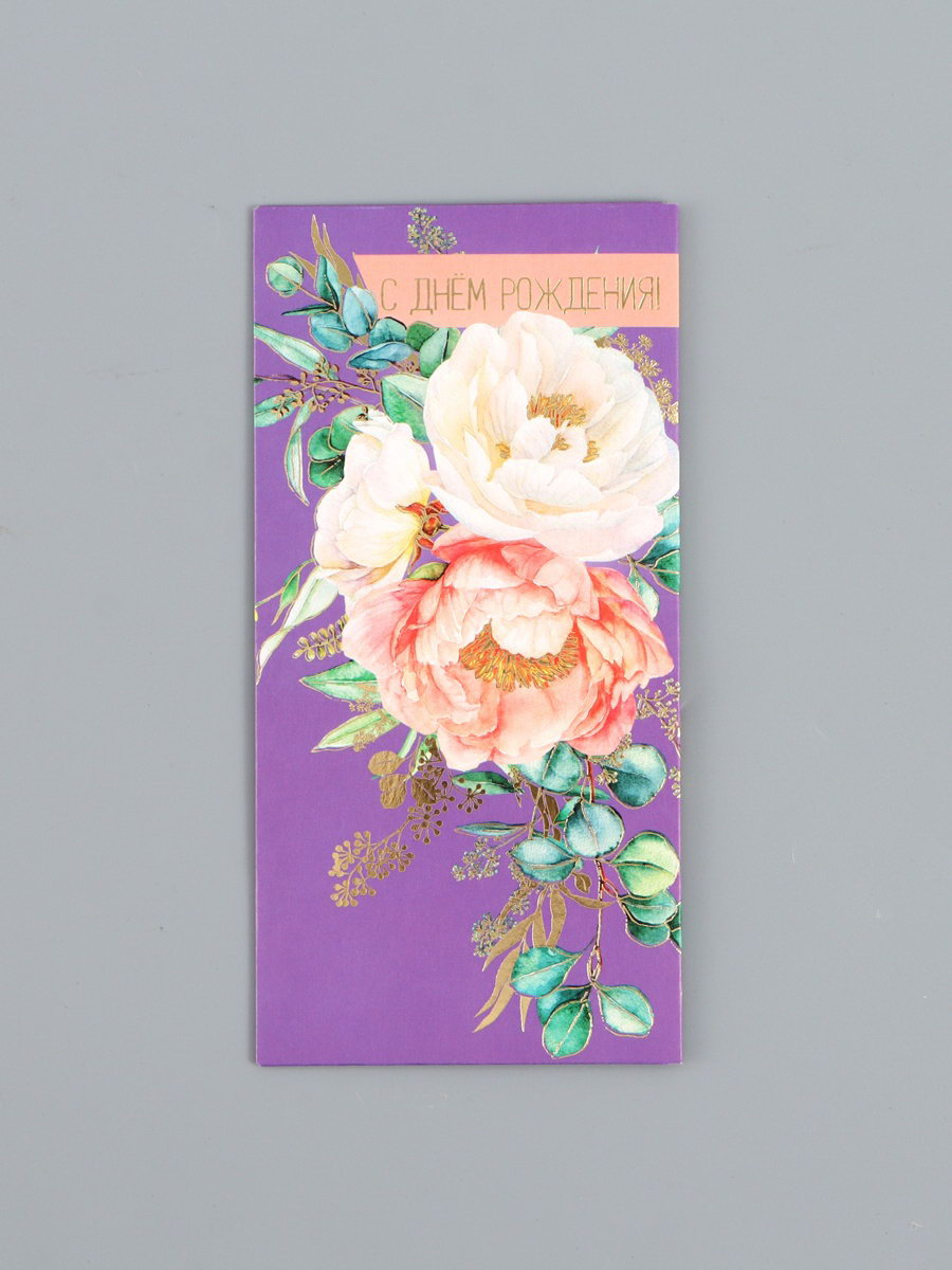 Конверт для денег "С днём рождения", цветы на фиолетовом, 16.5 x 8 см, Россия