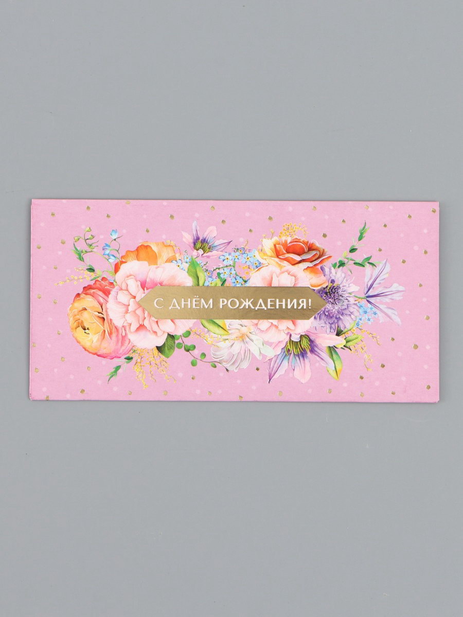 Конверт для денег "С днём рождения", цветы на сиреневом, 16.5 x 8 см, Россия
