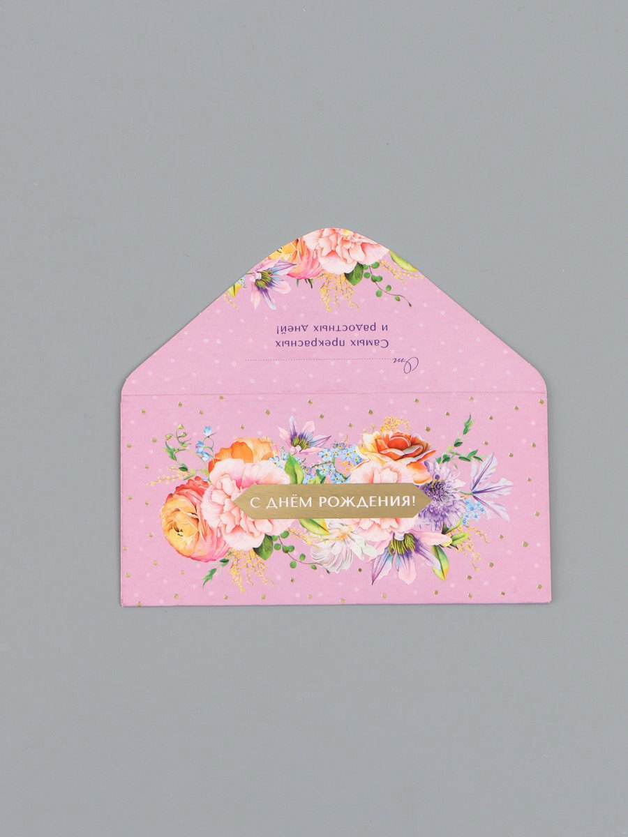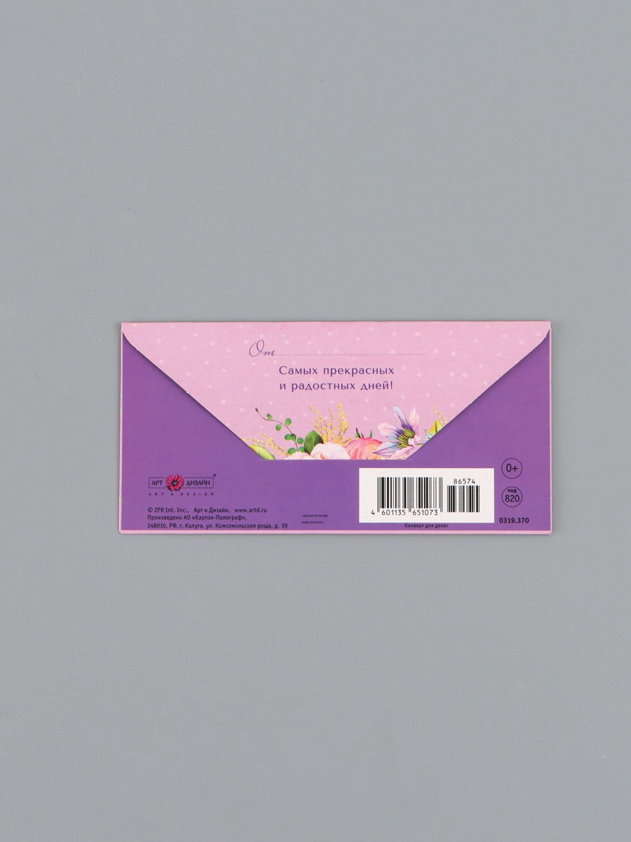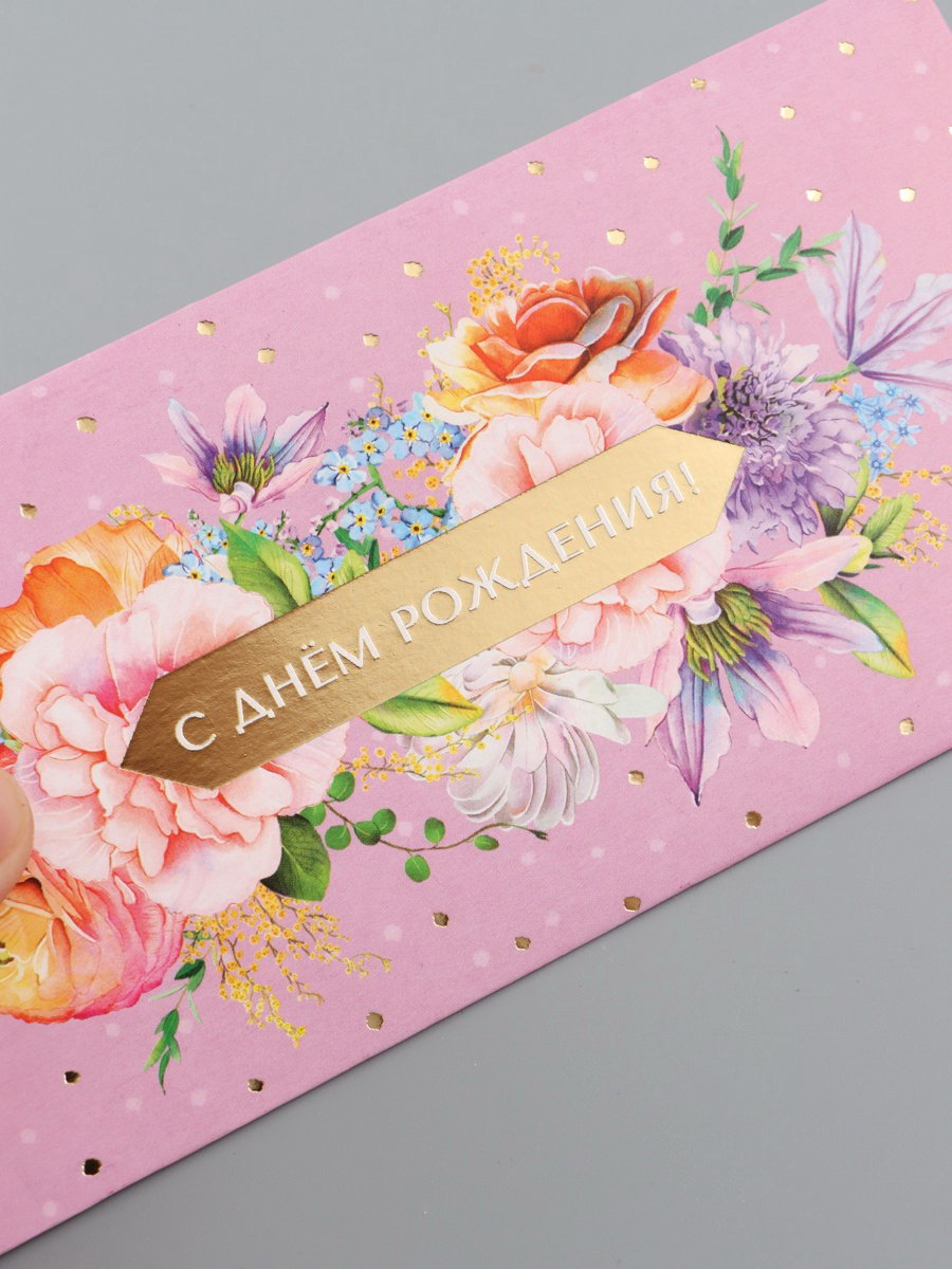 Конверт для денег "С днём рождения", цветы на сиреневом, 16.5 x 8 см, Россия