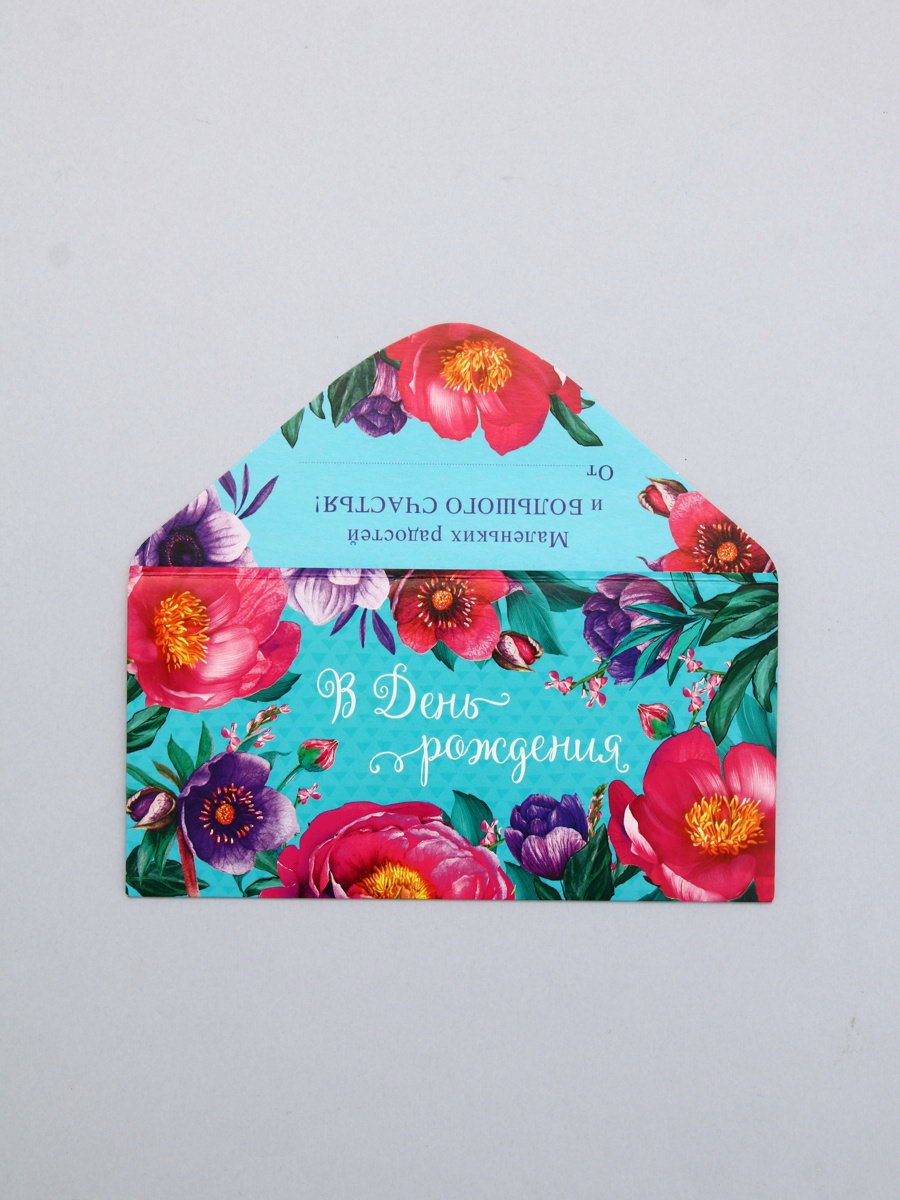 Конверт для денег "С днём рождения", цветы на бирюзовом, 16.5 x 8 см, Россия