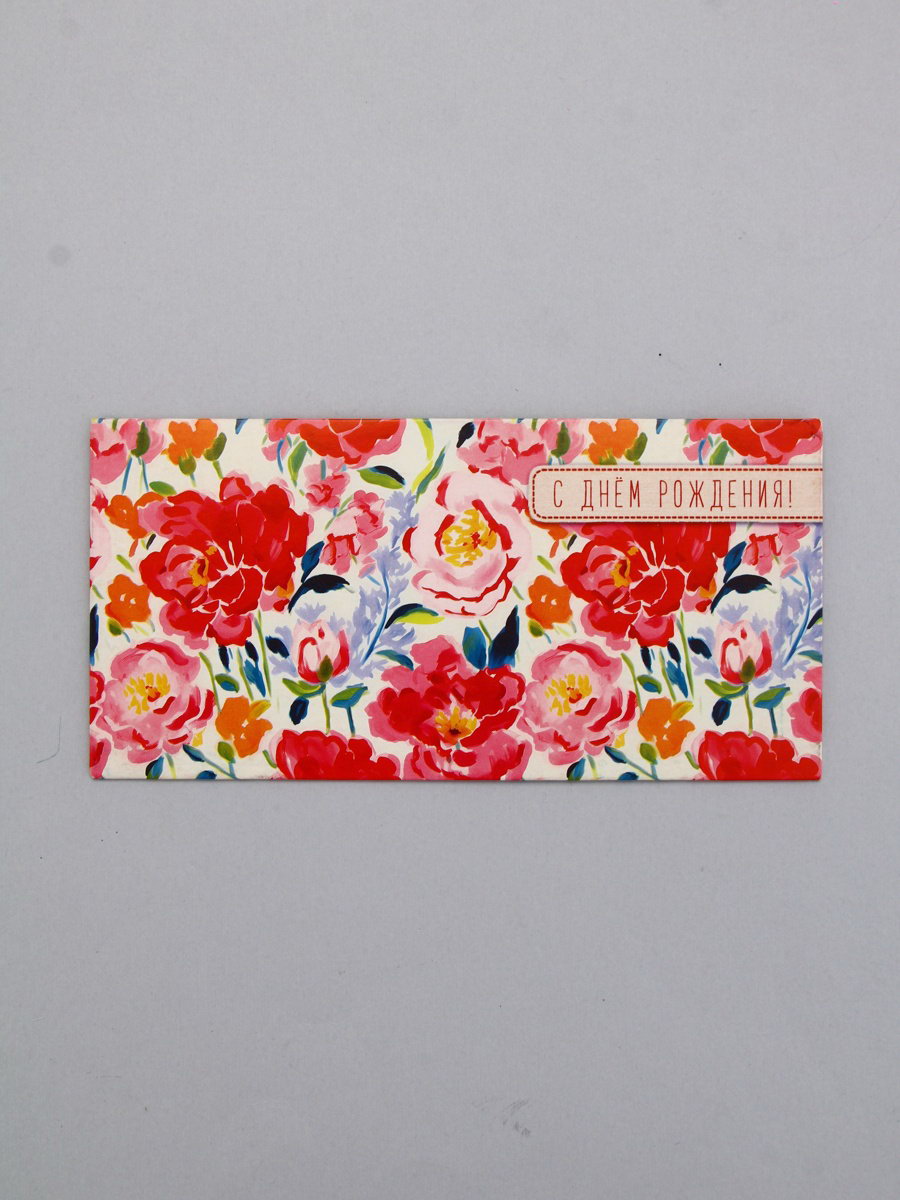 Конверт для денег "С днём рождения", красные цветы, 16.5 x 8 см, Россия
