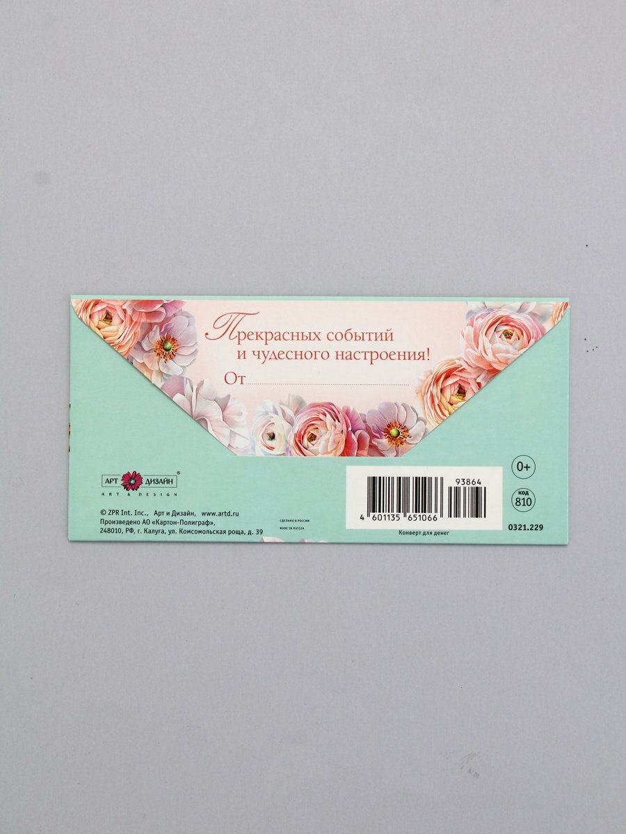 Конверт для денег "С днём рождения", ранункулюсы, 16.5 x 8 см, Россия