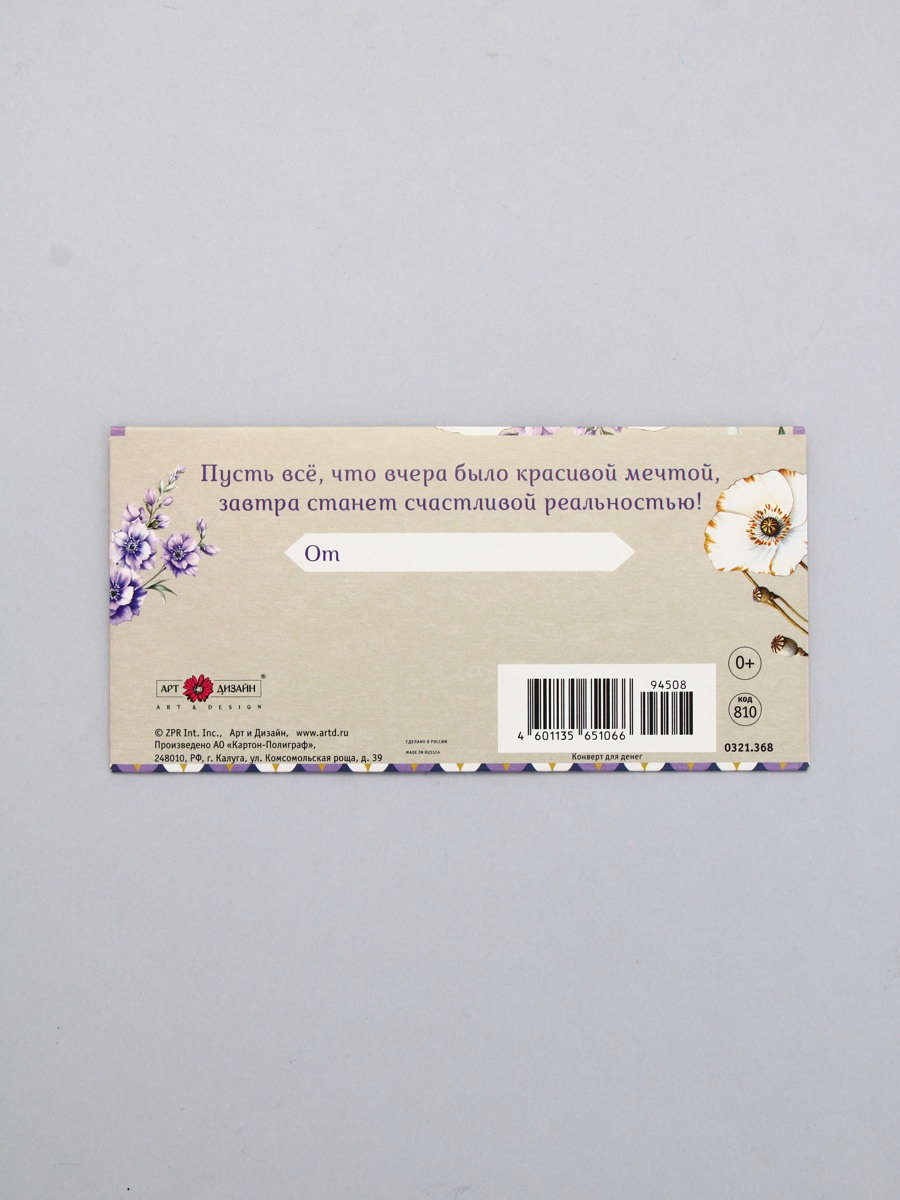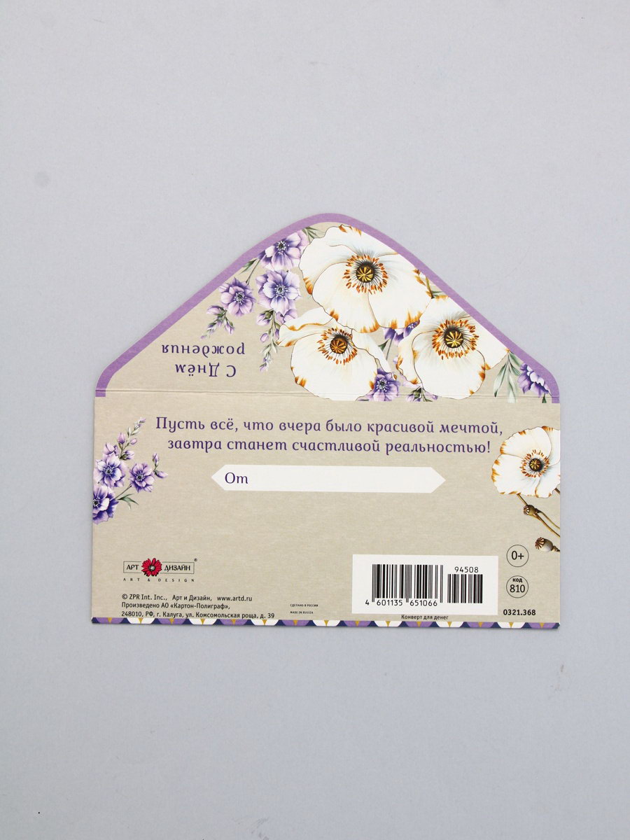 Конверт для денег "С днём рождения", белые цветы и орнамент, 16.5 x 8 см, Россия