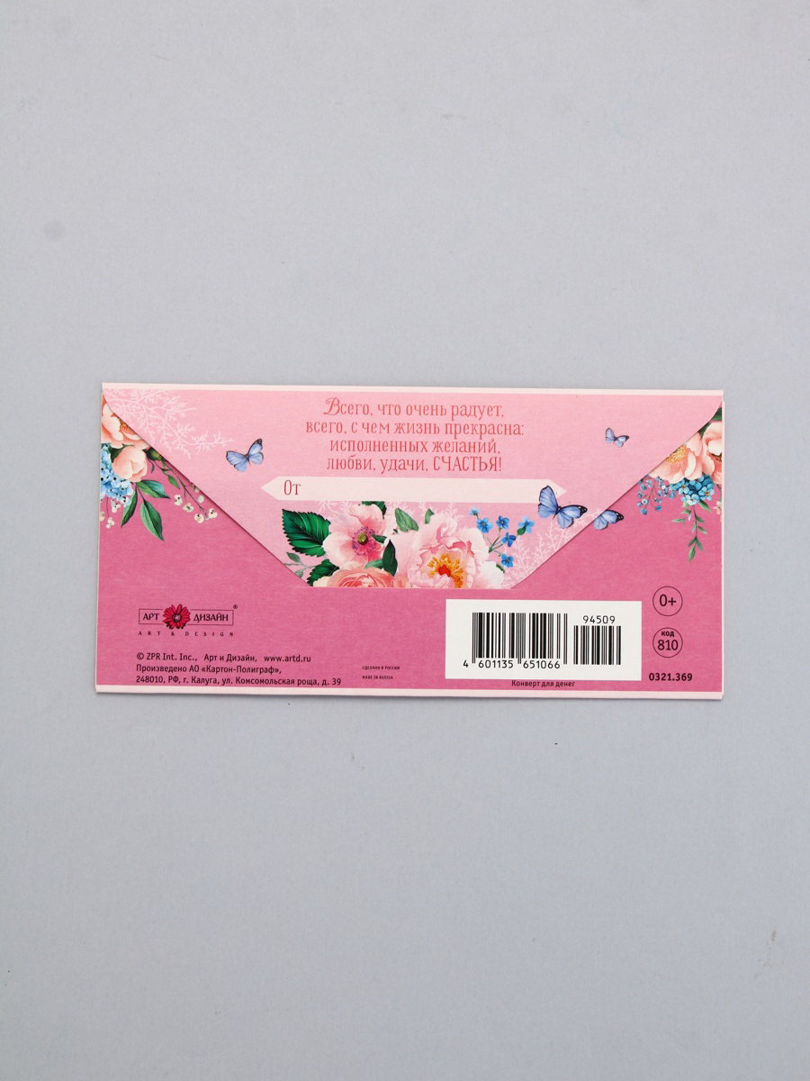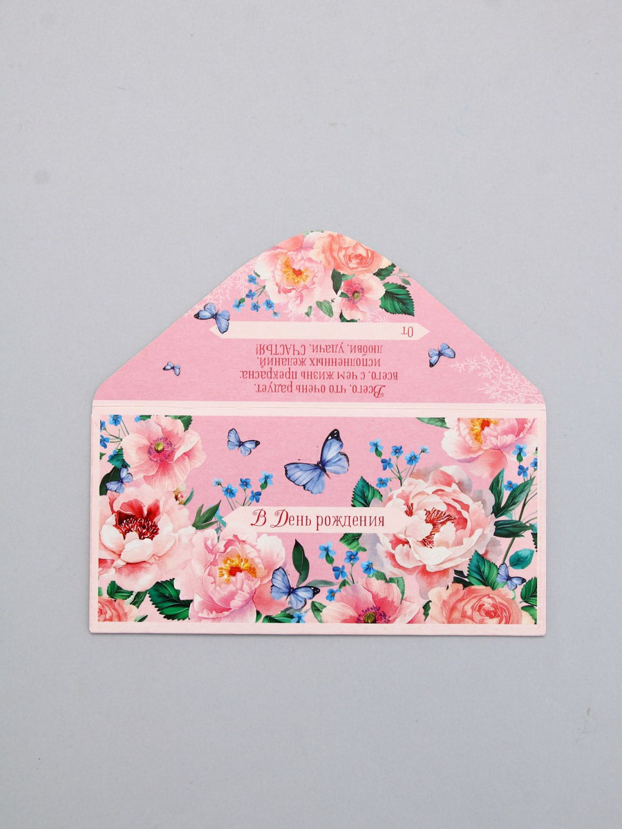 Конверт для денег "С днём рождения", цветы и бабочка, 16.5 x 8 см, Россия