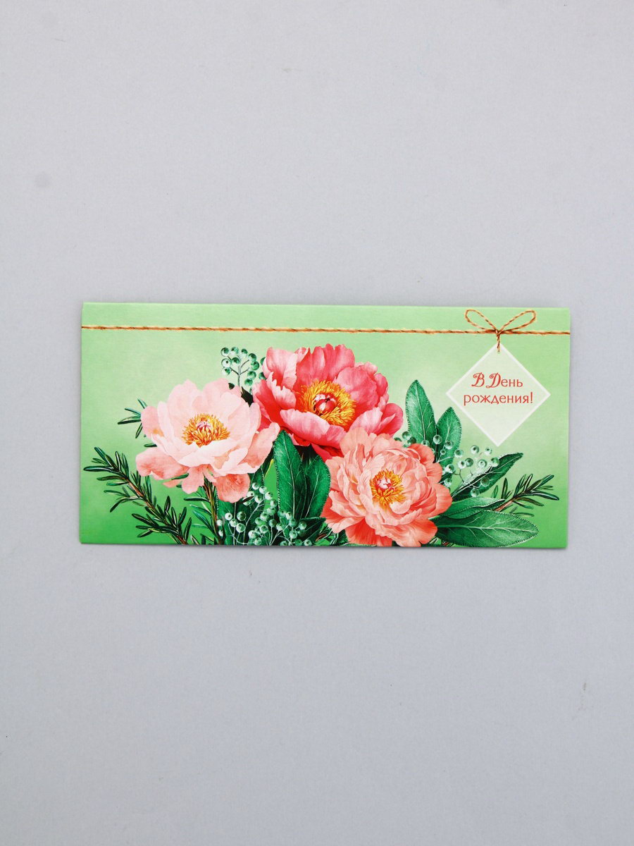 Конверт для денег "В День Рождения!", 3 цветка на зелёном, 16.5 x 8 см, Россия