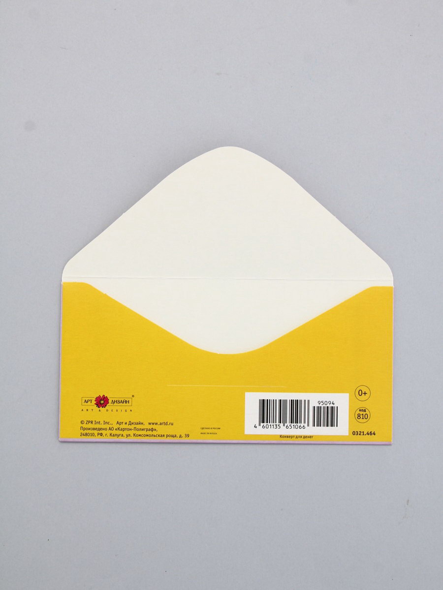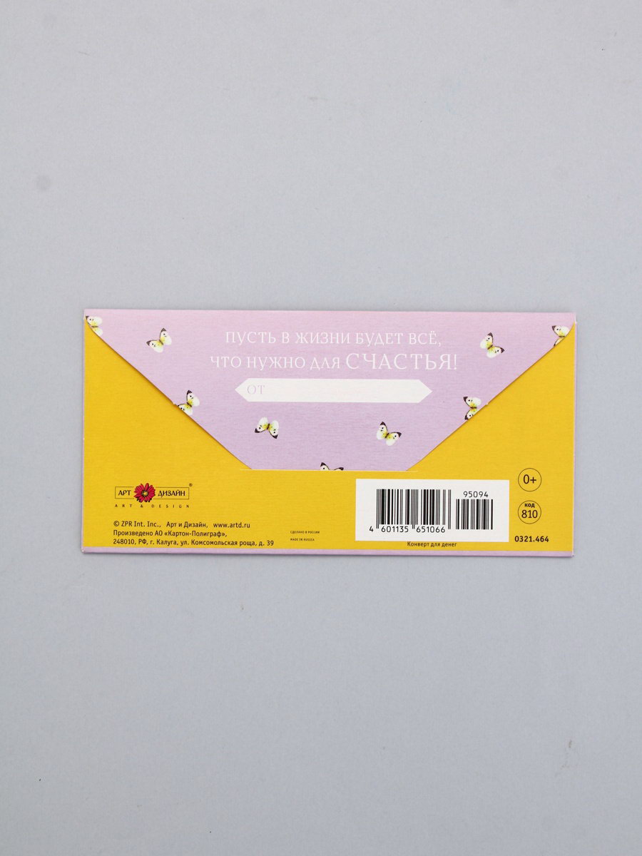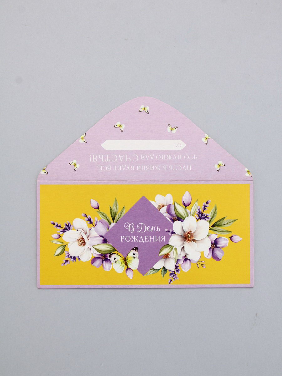Конверт для денег "В День Рождения!", сиреневый и жёлтый, 16.5 x 8 см, Россия