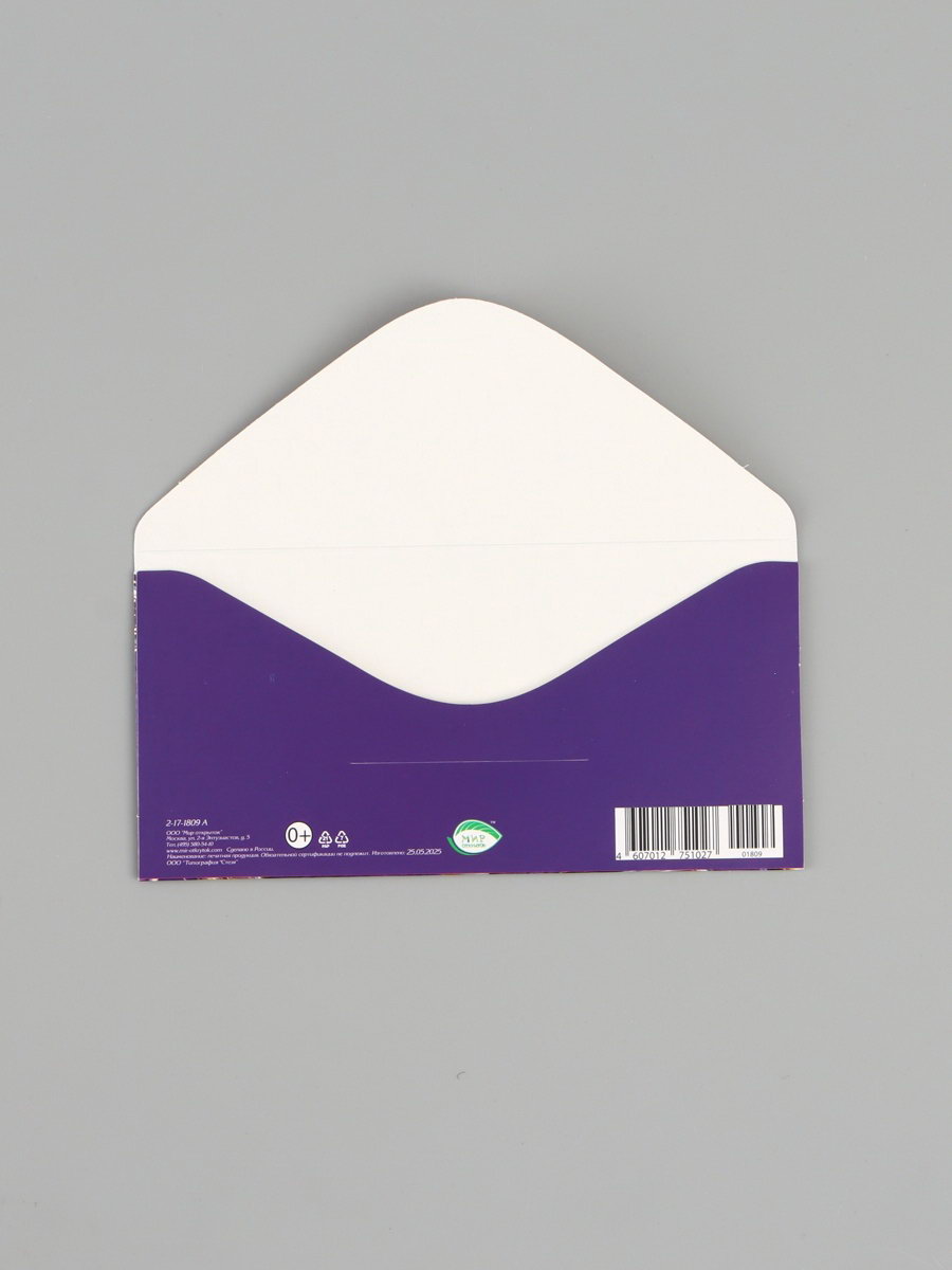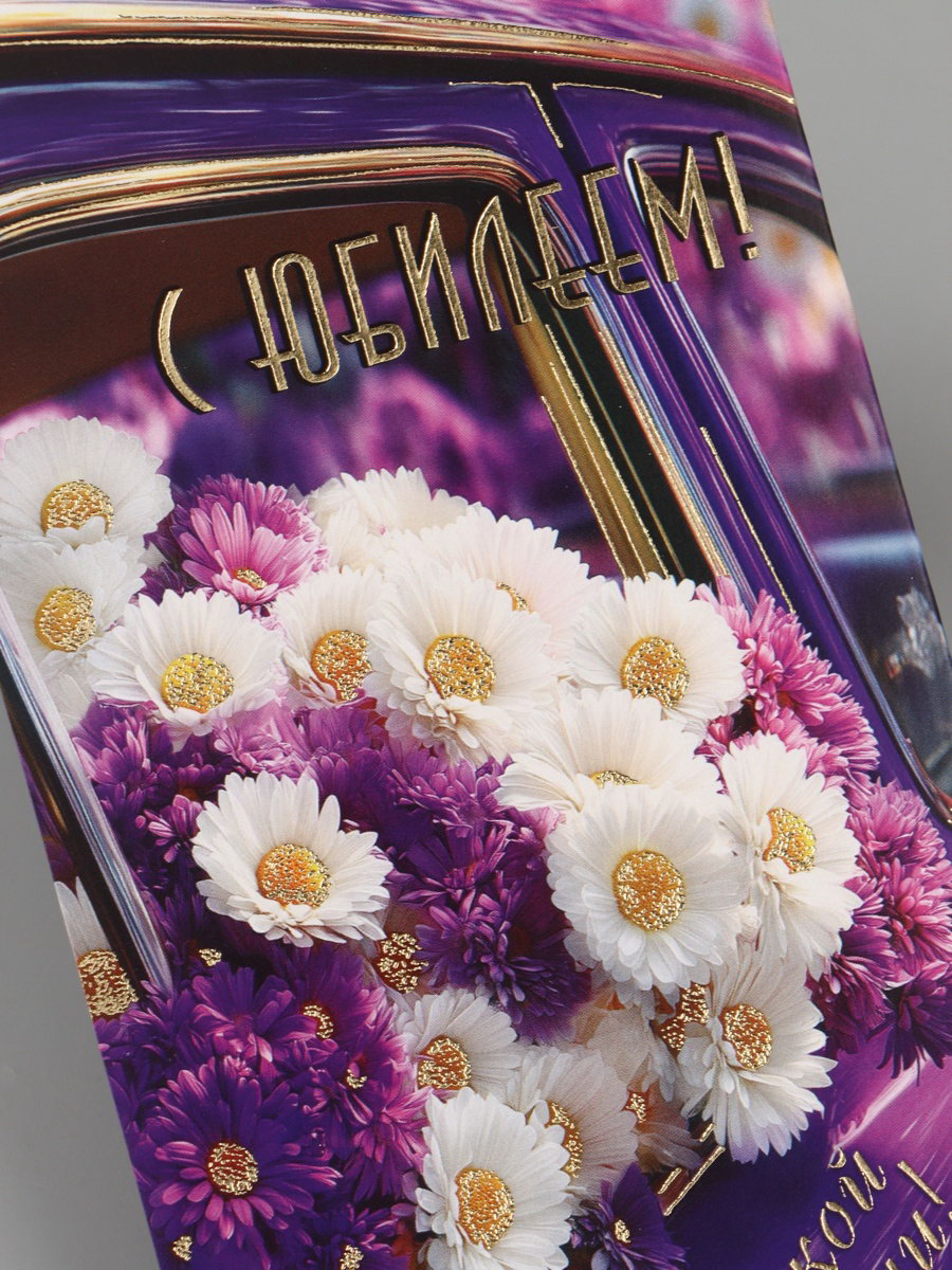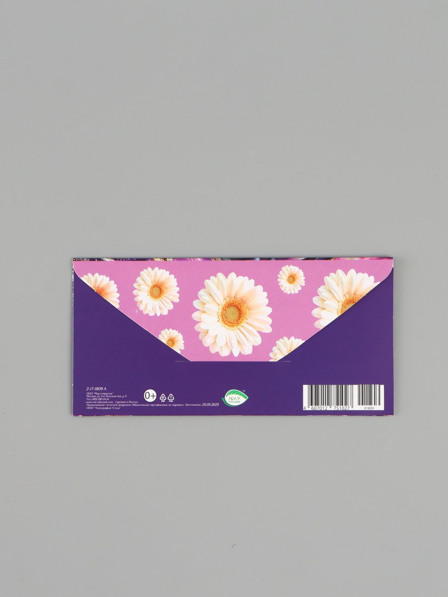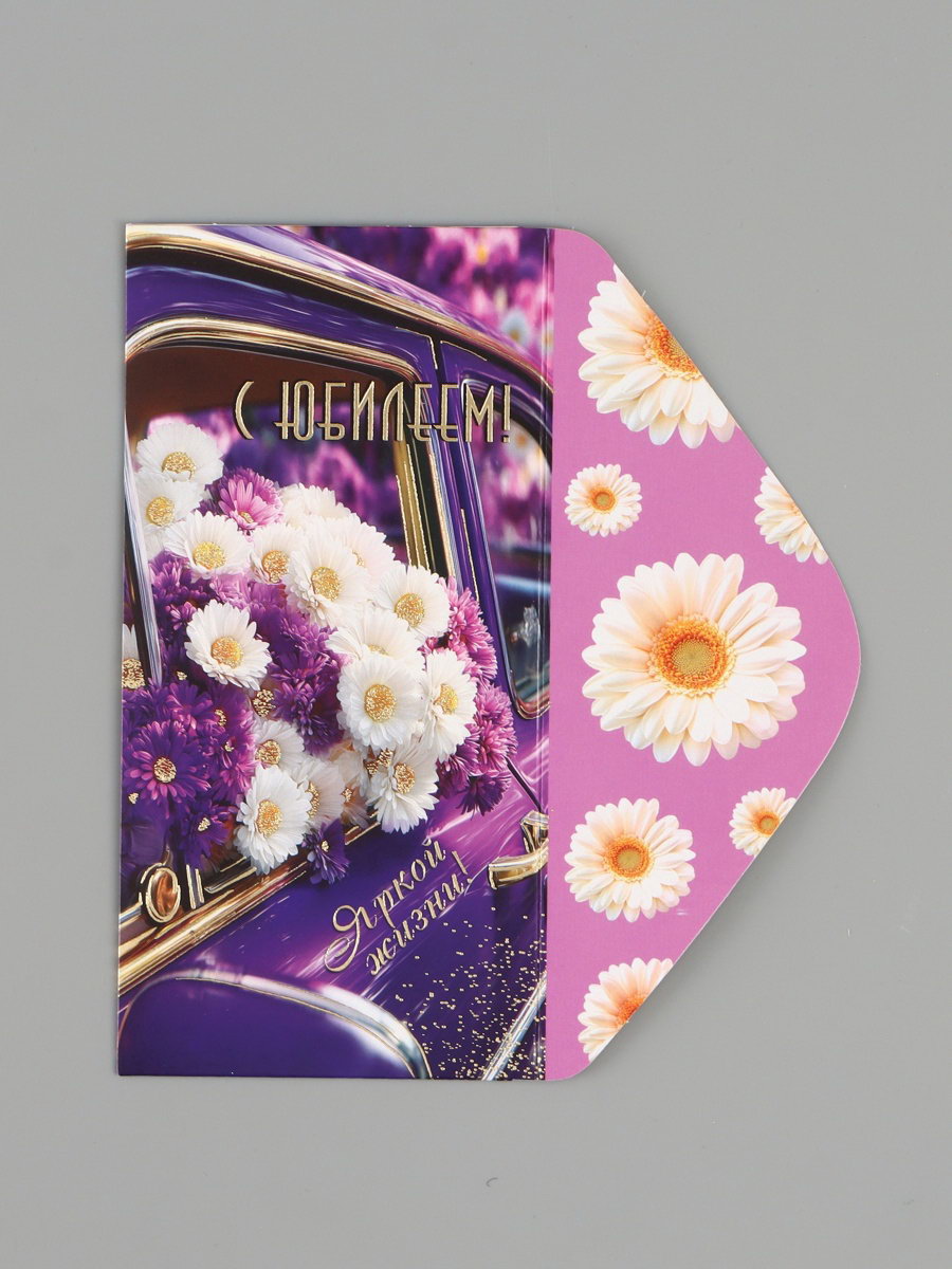 Конверт для денег "С юбилеем!", ромашки, сиреневый, 16.5x8 см, Россия