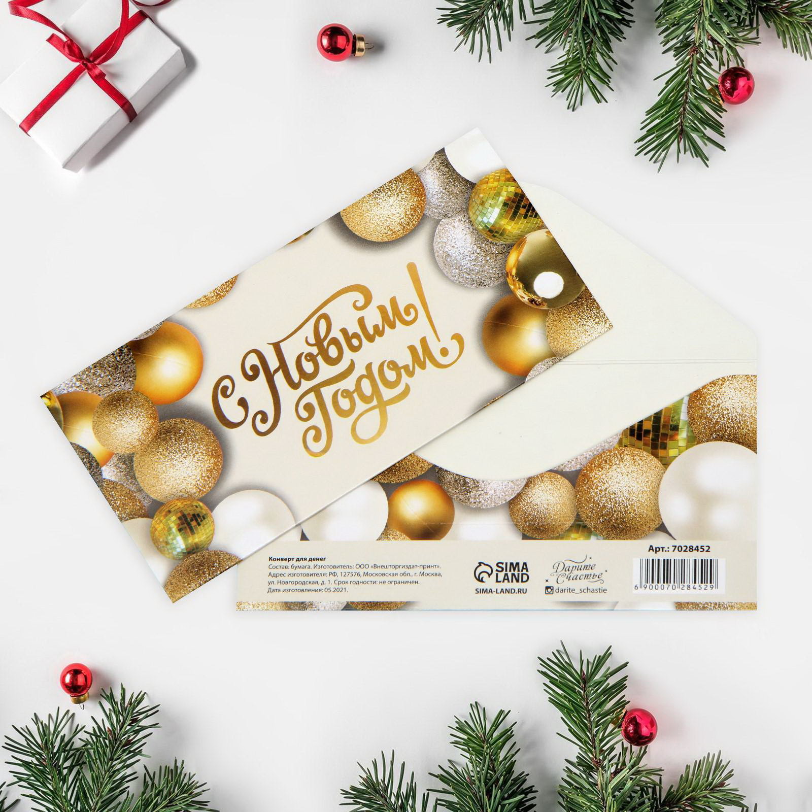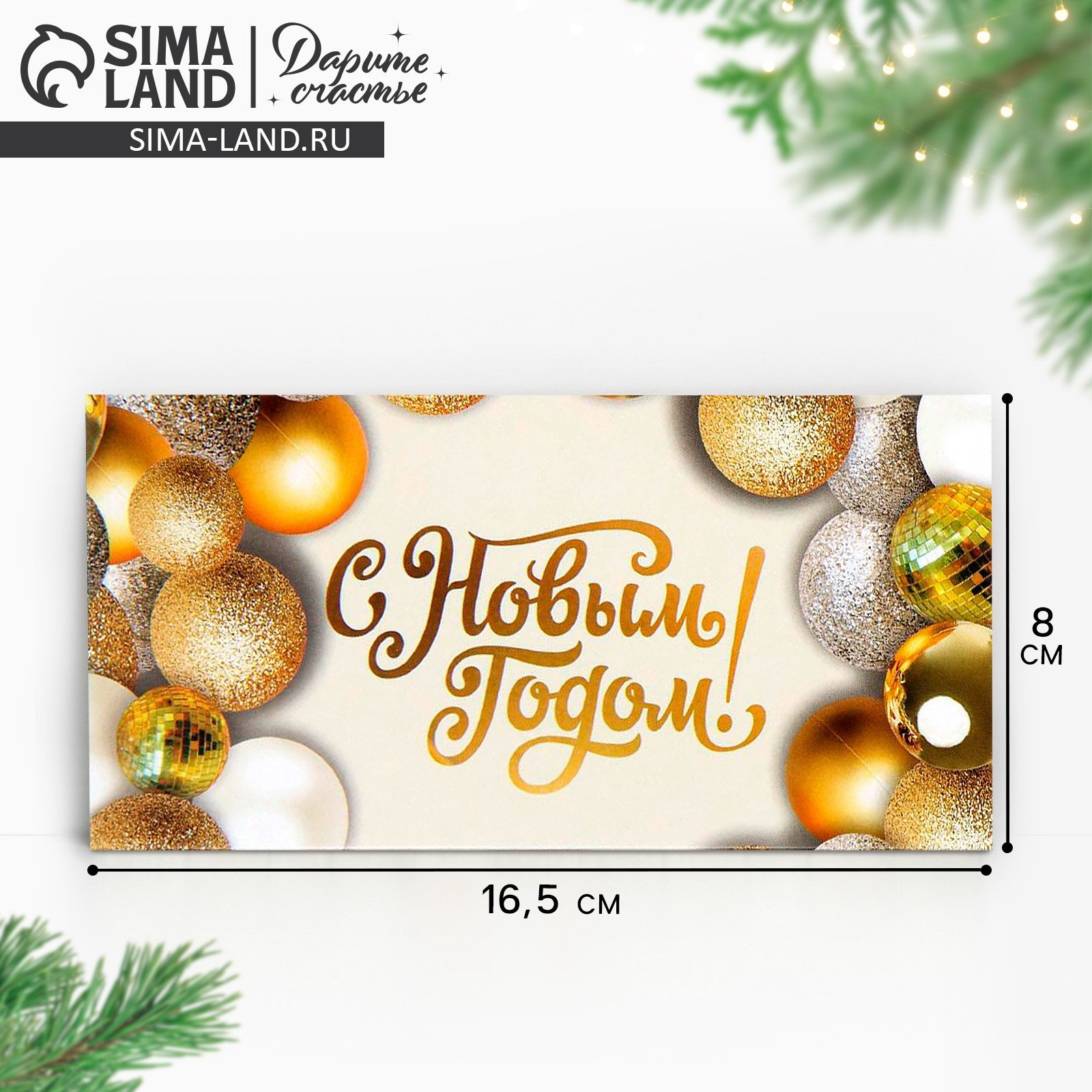 Конверт для денег "Золотистые шары", 16.5 x 8 см, Новый год, Дарите Счастье, Россия