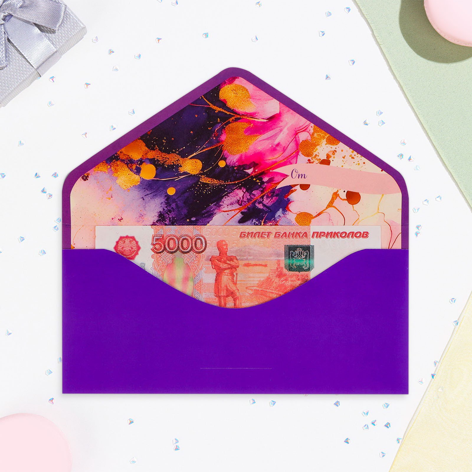 Конверт "Для тебя!" вырубка, тиснение, софт тач, фиолетовый фон, Арт и Дизайн, Россия