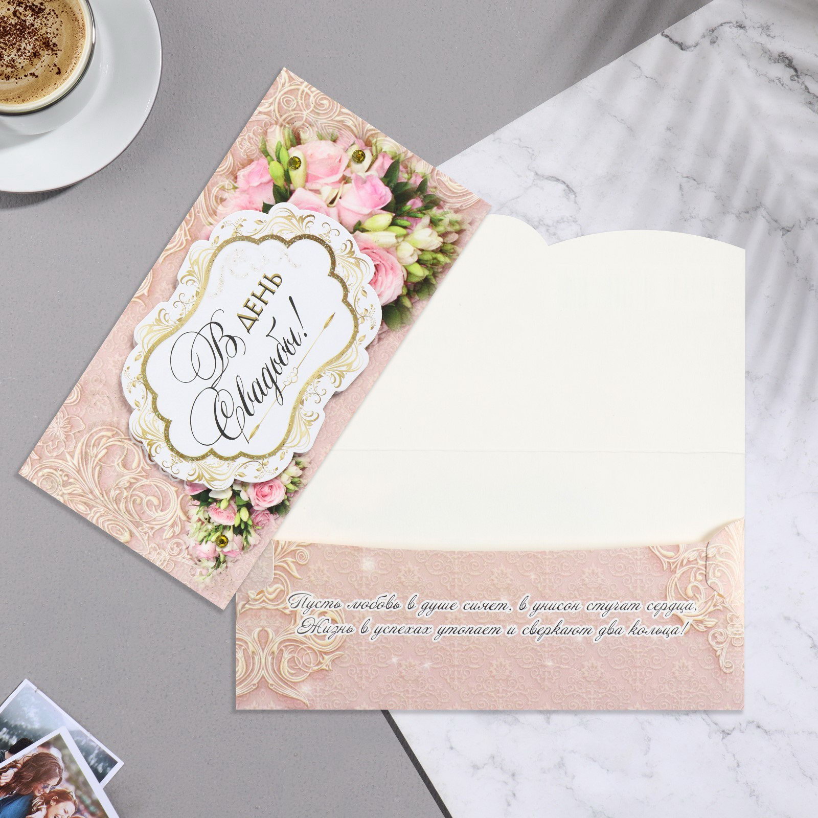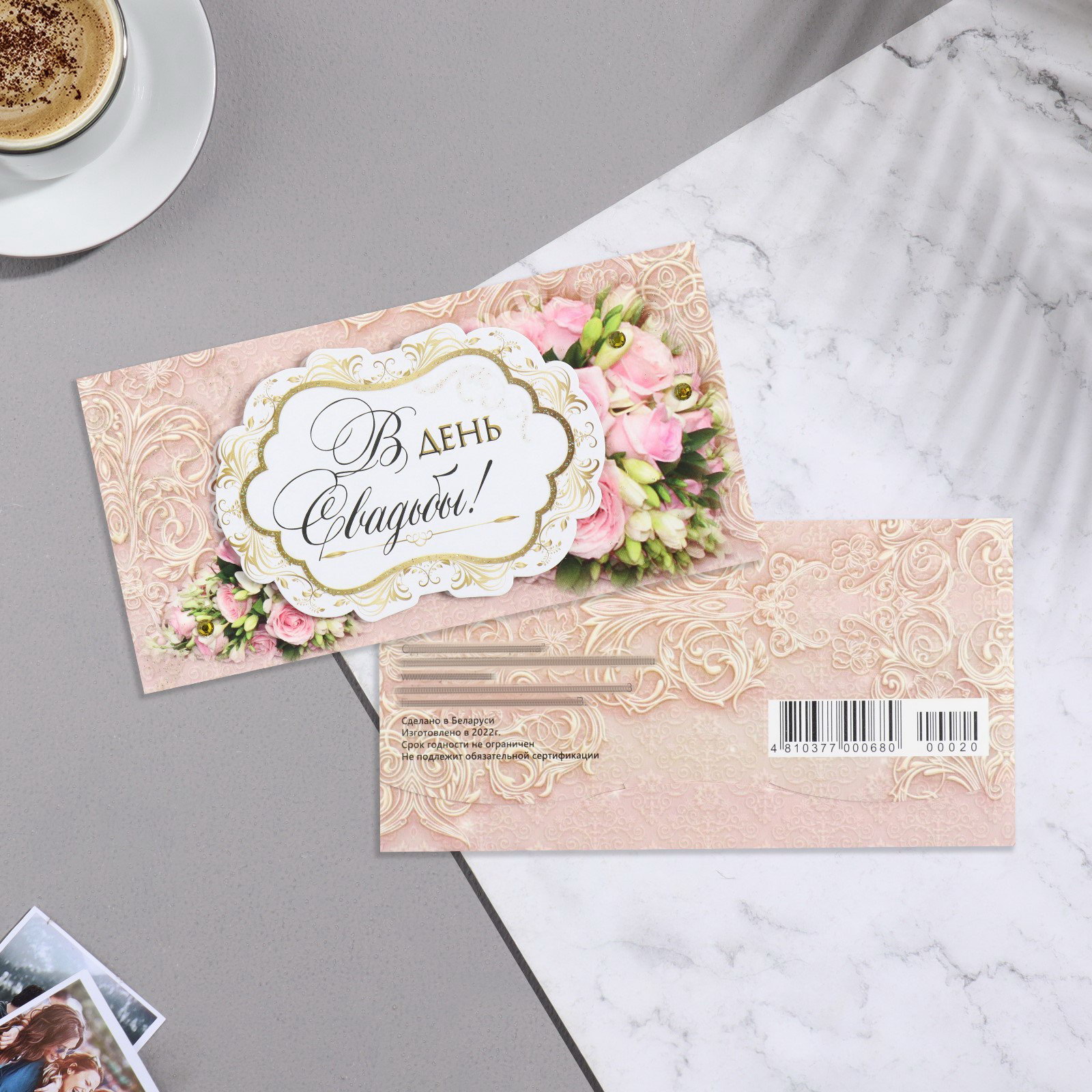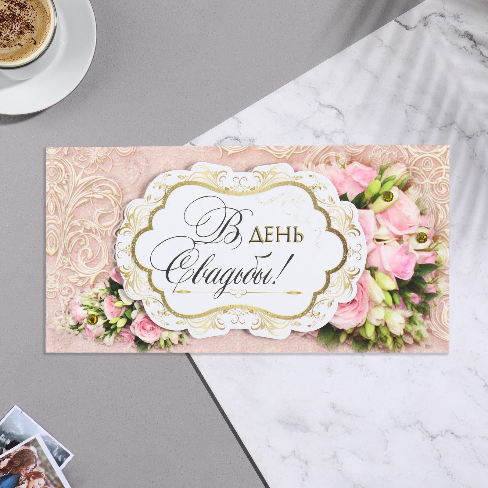 Конверт для денег "В День Свадьбы!" ручная работа, бежевый фон, 17х8.8 см, Стильная открытка, Россия