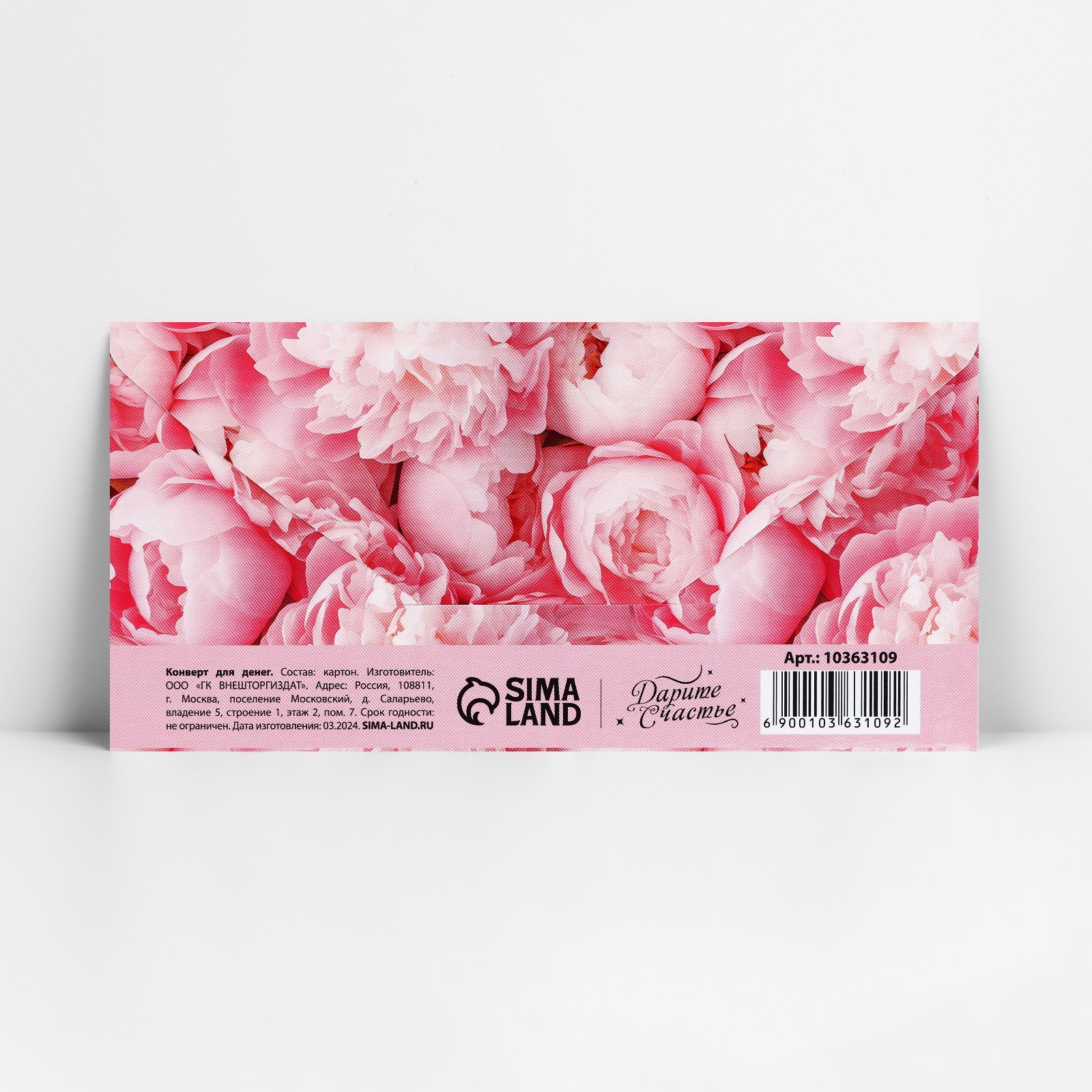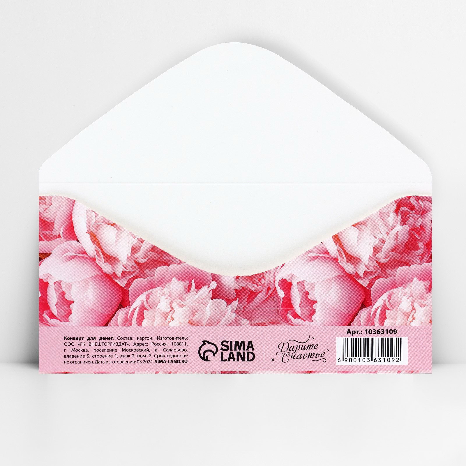 Конверт для денег "Пионы", 16.5x8 см, Дарите Счастье, Россия