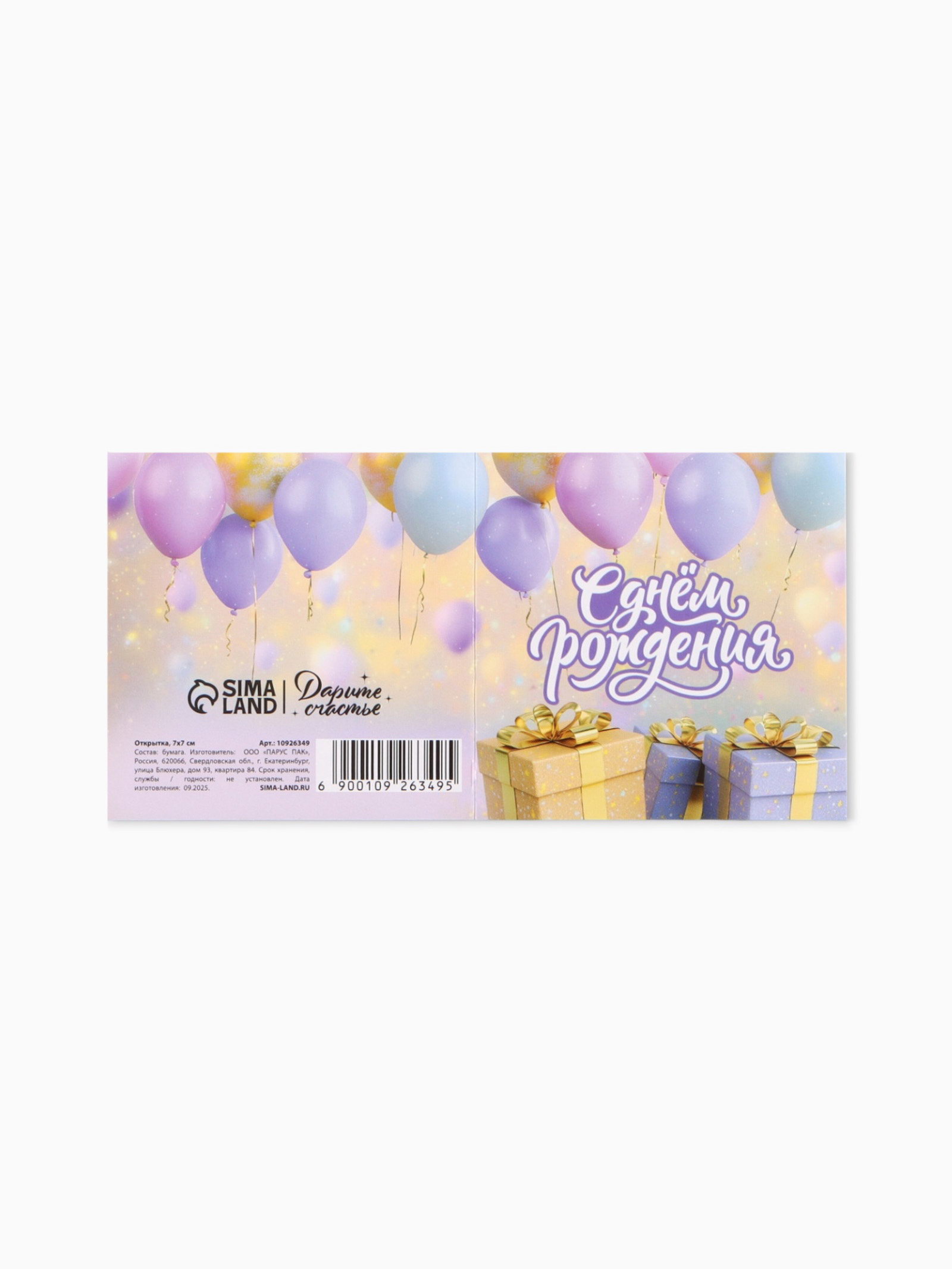 Размер упаковки: 7 x 0.1 x 7 см. tnved: 4909000000 Форма: Квадрат Размер: Мини (до 8 см) см Особенности: Без особенностей Для кого: Для женщины Адресат: Без адресата Отделка: Без отделки Тематика праздника: День рождения | ||