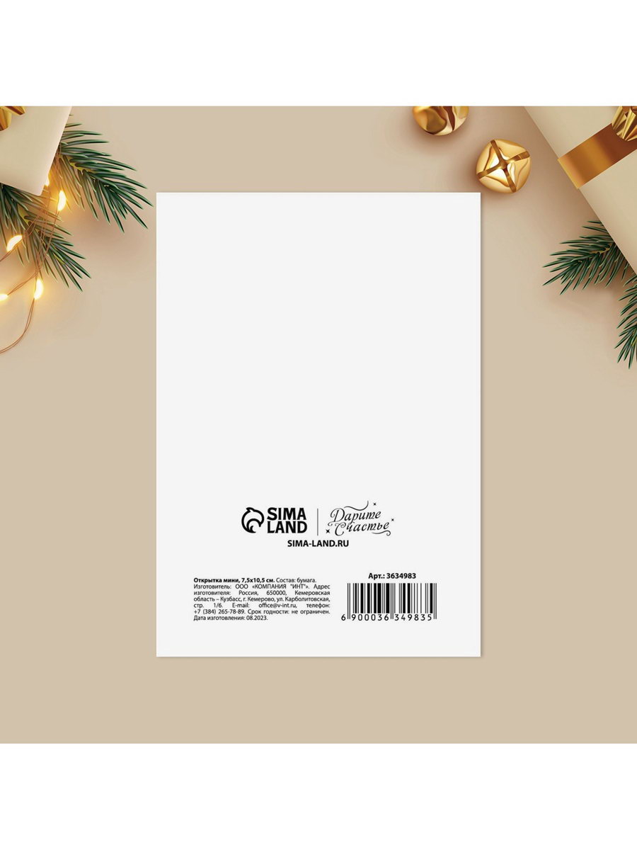 Размер упаковки: 7.5 x 0.1 x 10.5 см. Для кого: Унисекс Тематика праздника: Новый год Адресат: Без адресата Особенности: Без особенностей Форма: Стандарт Размер: Малый (9-15 см) см Отделка: Без отделки tnved: 4909000000 Символ года: Нет Открытка одинарная, на обороте снизу инфоблок (ШК, производитель), остальное поле белое. | ||