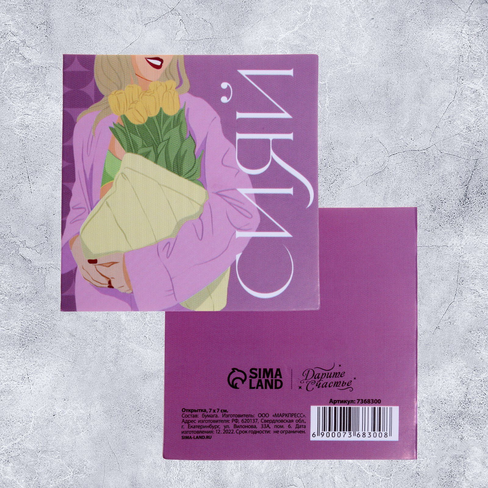 Размер упаковки: 7 x 0.1 x 14 см. tnved: 4909000000 tnved: 4909000000 Размер: Мини (до 8 см) см Форма: Квадрат Температурное ограничение: Нет Тематика праздника: 8 Марта Отделка: Без отделки Особенности: Без особенностей Тематика: Женская | ||