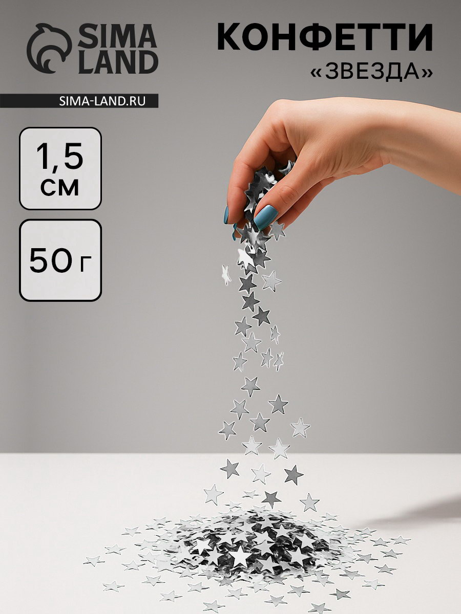 Конфетти "Звезда", серебро, хром, 1.5 см, 50 г, Волна Веселья, Китай