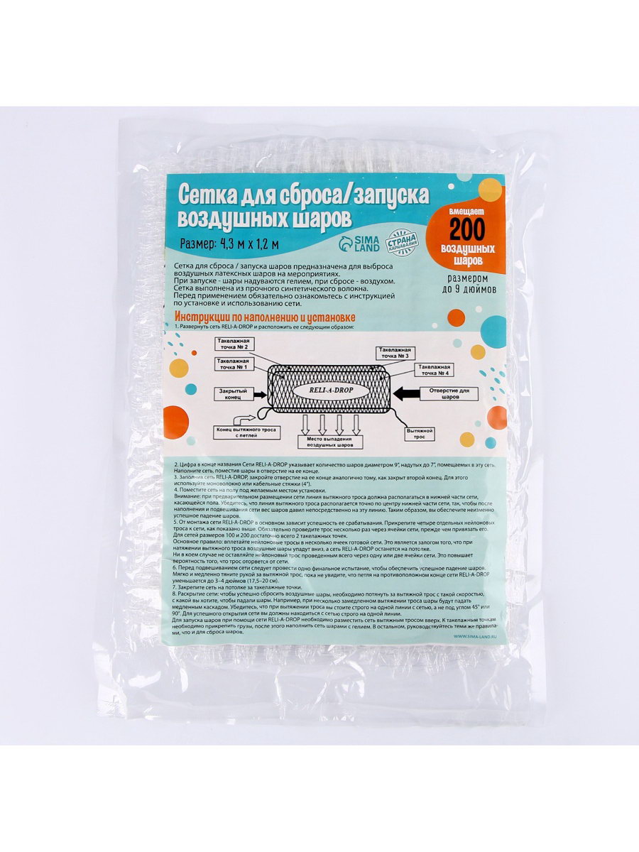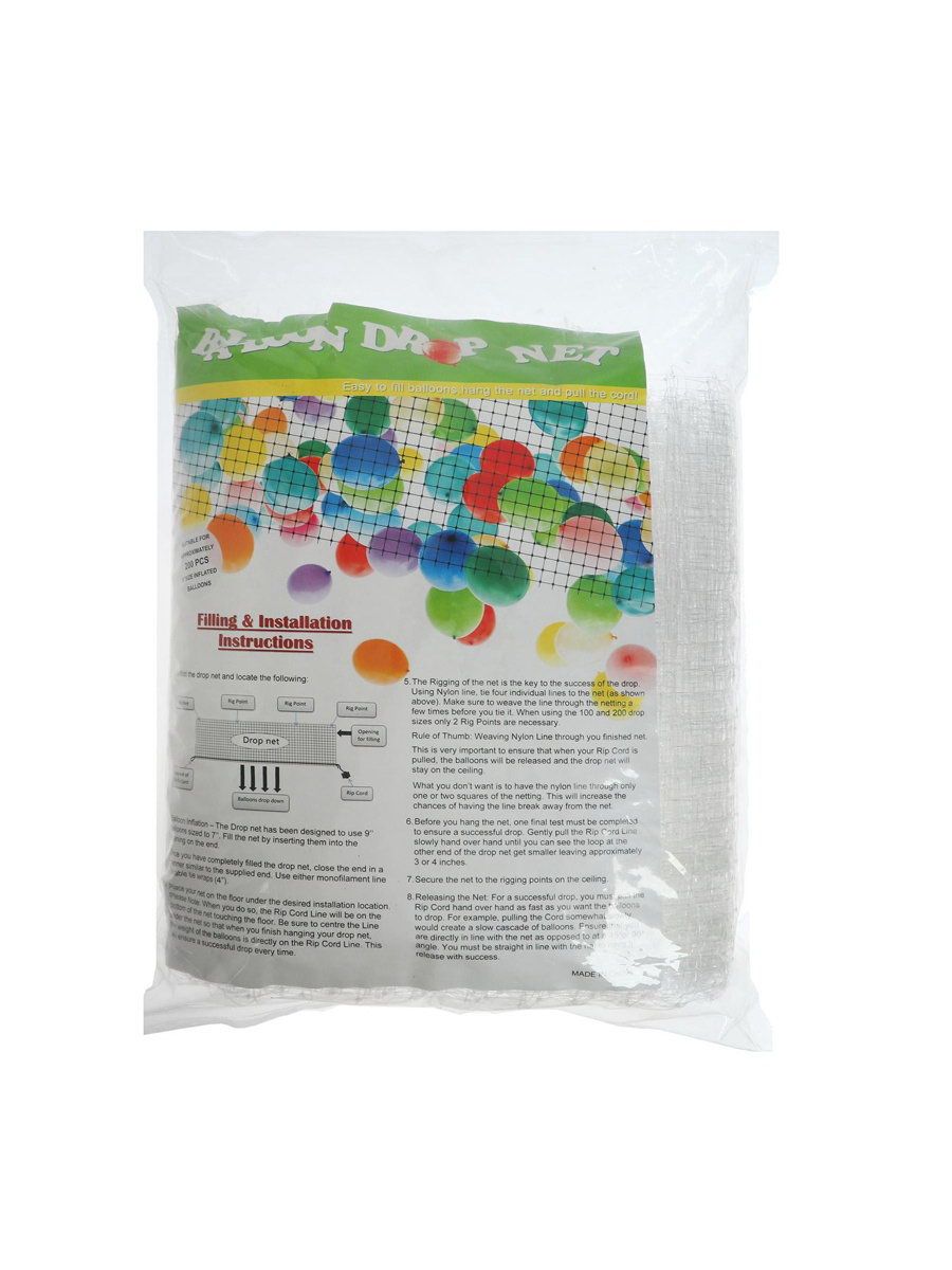 Размер упаковки: 23 x 6 x 34 см. Цвет: Белый Набор: Нет tnved: 5608192000 Сетка для сброса/запуска шаров вмещает 200 воздушных шаров размером до 9 дюймов. Размер сетки: 4,3 м x 1,2 м. | ||