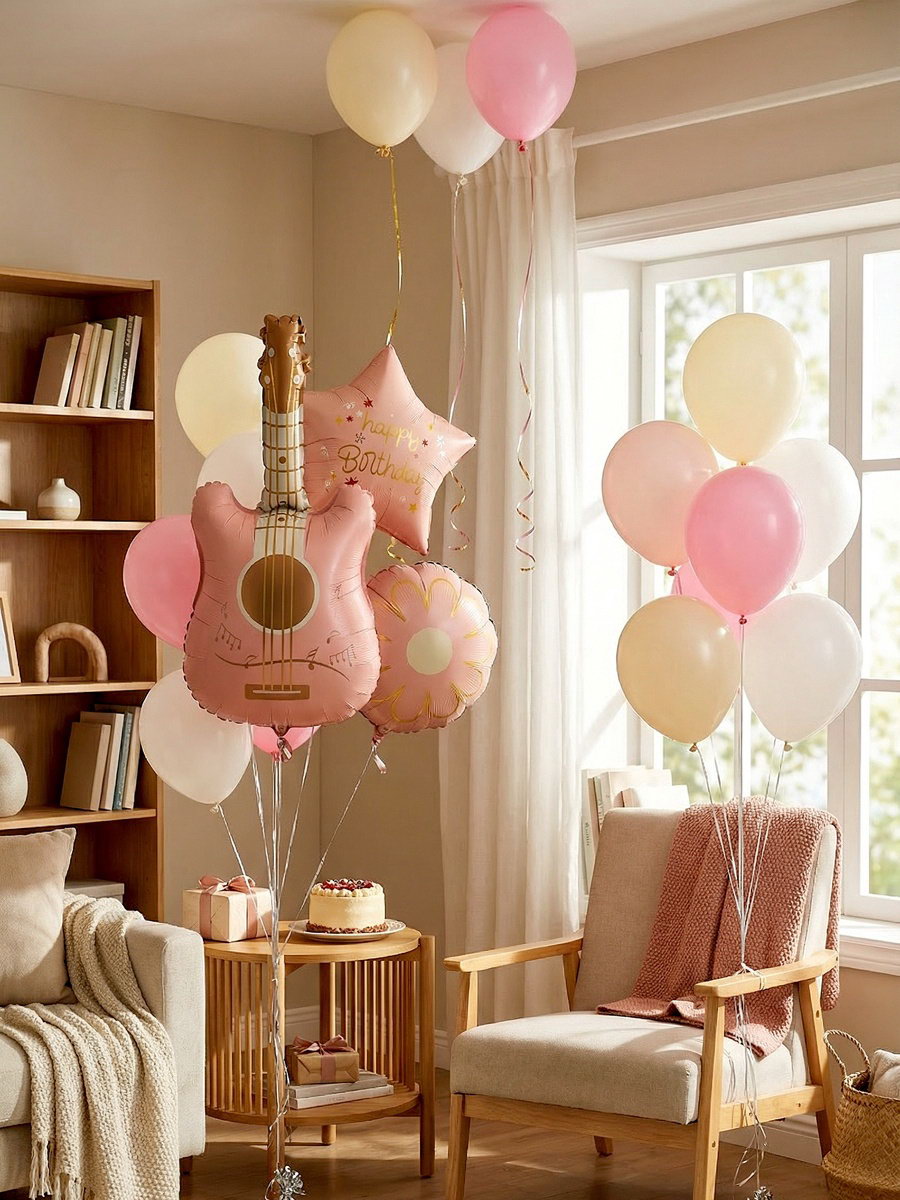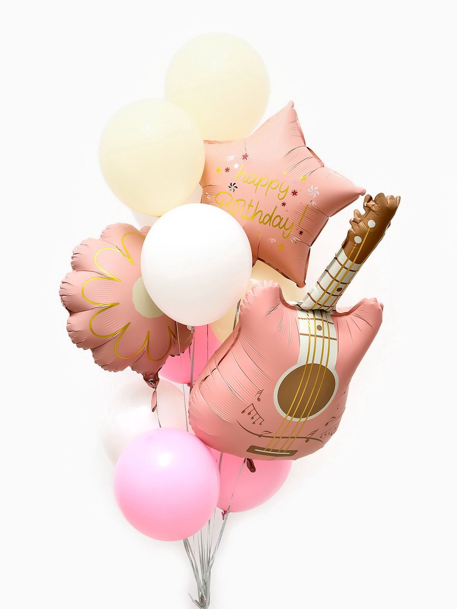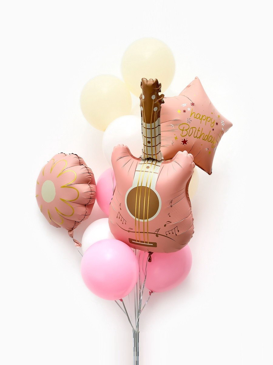 Надувка шара: Воздухом, Гелием Оттенок: Пастель, Сатин Цвет: Бежевый, Белый, Розовый Составляющие набора: Звезда, Классический, Фигура Размер упаковки: 17.5 x 0.6 x 21.3 см. tnved: 9503010000 Тематика рисунка: День Рождения Вид шара: Фигура Адресат: Без адресата Набор: Да В наборе, шт.: 12 Тематика праздника: День рождения Вид: Шары Букет из шаров "Розовая гитара" это эффектное сочетание фольгированных и латексных шаров. Набор из 12 шаров станет стильным украшением для праздника. Особенности набора