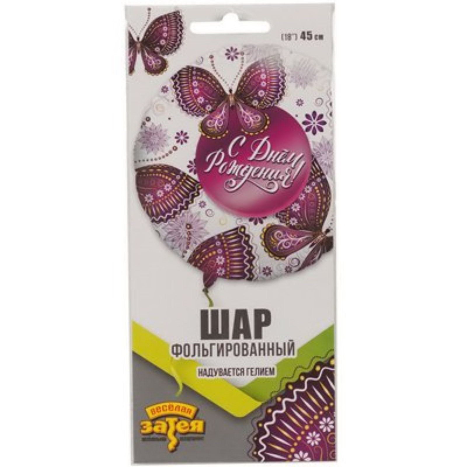 Шар фольгированный 18""С днём рождения!", бабочки, Весёлая Затея, Китай