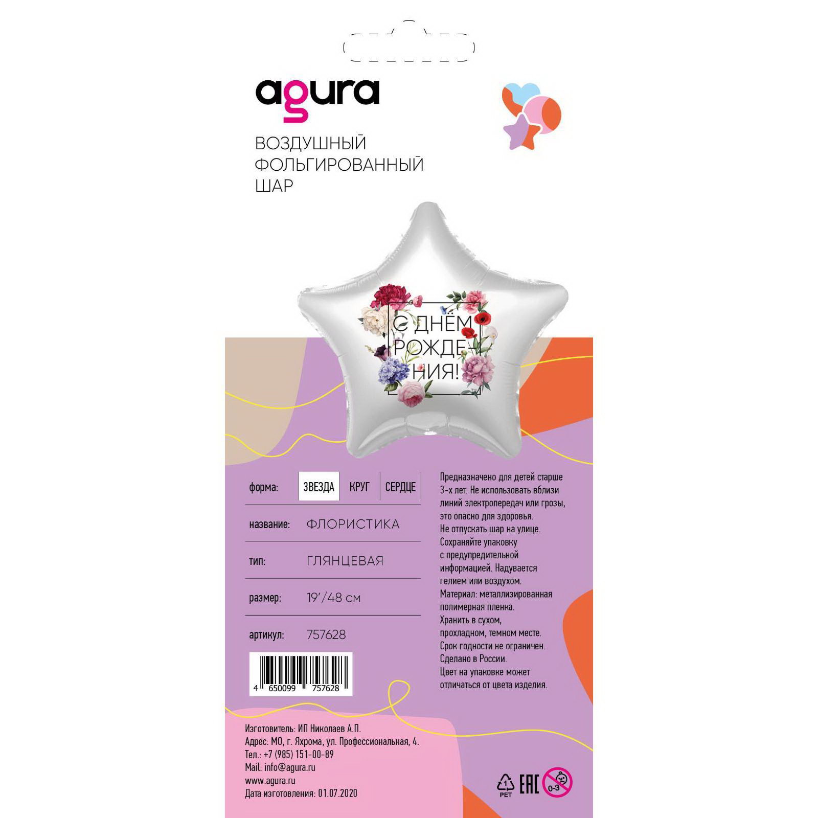Шар фольгированный 19""Флористика", звезда, 1 шт., в упаковке, AGURA, Россия