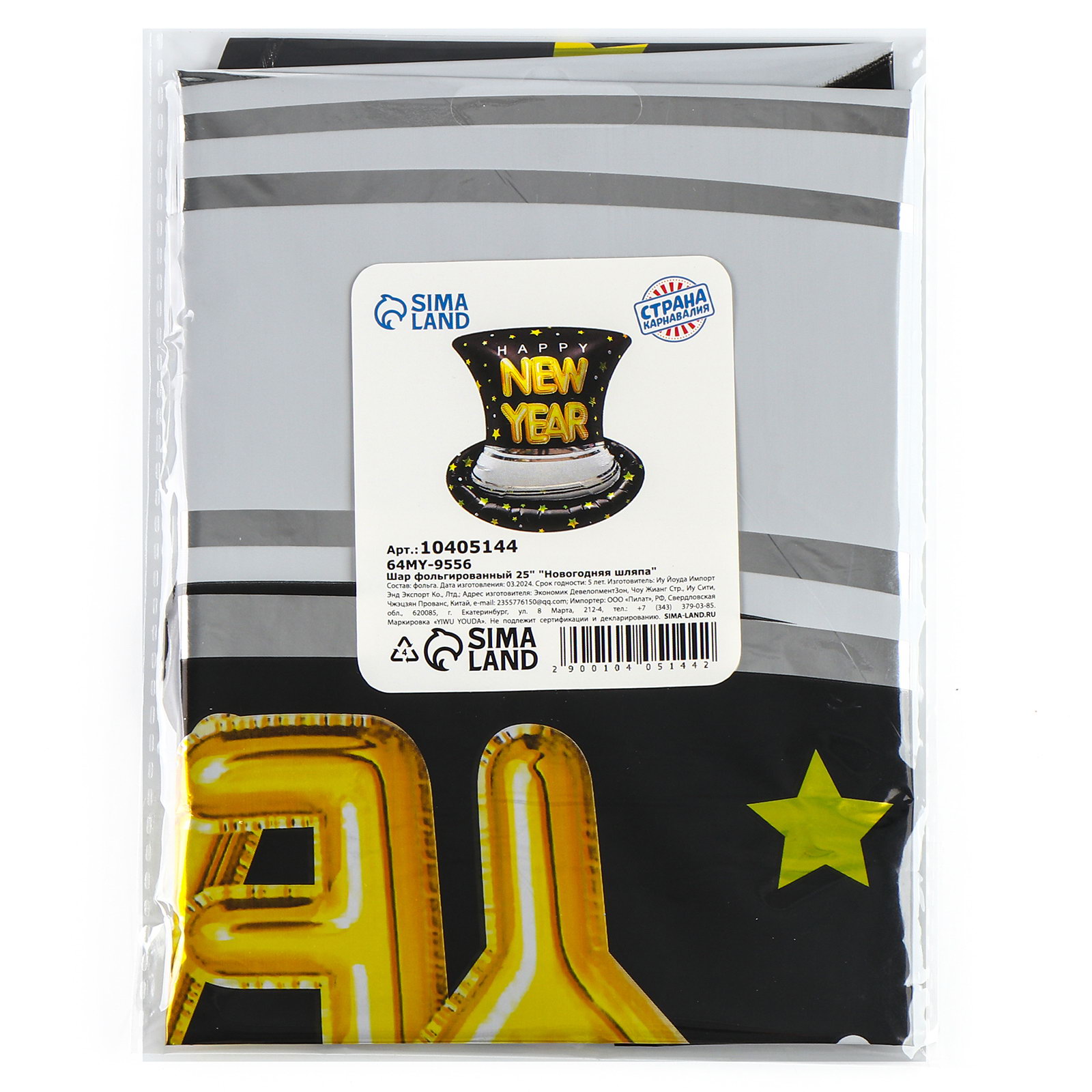 Надувка шара: Воздухом, Гелием Вид: Воздушные шары, Шары Размер упаковки: 14 x 0.4 x 19 см. Диаметр, дюйм: 25 Вид шара: Фигура Тематика рисунка: Новый год Рисунок: Да Набор: Нет Наличие клапана: Да Тематика праздника: Новый год Цвет: Чёрный Оттенок: Глянец Индивидуальная упаковка: Да Индивидуальная упаковка: Да tnved: 9505900000 Язык надписи: Английский Фольгированный шар "Новогодняя шляпа" 25" это милое и праздничное украшение для вашего дома. Шар в форме шляпы с надписью будет идеальным дополнением уютной атмосферы на Новый год. Благодаря клапану, шар легко надувается как воздухом, так и гелием, и долго сохраняет свою форму. Особенности