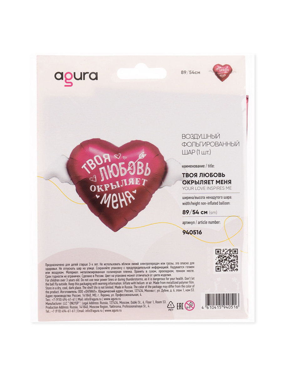 Воздушный шар фольгированный 35""Твоя любовь окрыляет", AGURA, Россия