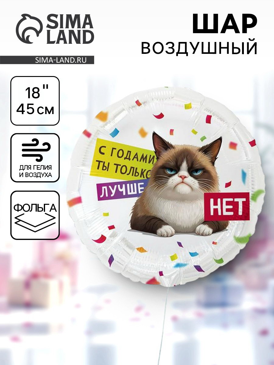 Надувка шара: Воздухом, Гелием Размер упаковки: 10 x 0.5 x 20.5 см. tnved: 9503010000 Температурное ограничение: Нет Диаметр, дюйм: 18 Оттенок: Глянец Адресат: Без адресата Персонажи: Кошка, кот Наличие клапана: Да Индивидуальная упаковка: Нет Рисунок: Да Набор: Нет Тематика рисунка: День Рождения Цвет: Разноцветный Вид шара: Круг Фольгированный воздушный шар "С годами ты лучше" – это уникальное украшение для праздника! Он добавит оригинальности и яркости мероприятию. С таким шаром ваше событие будет выделяться! Преимущества: