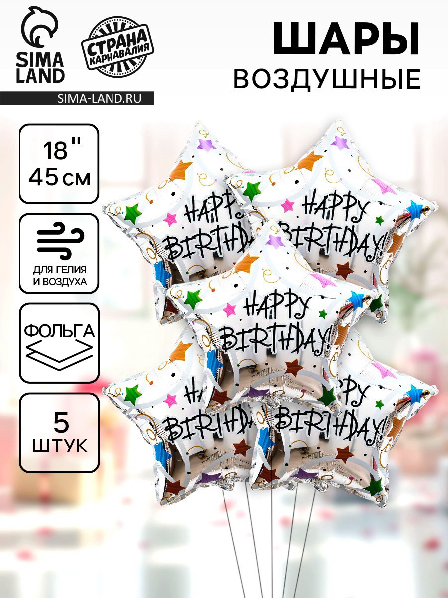 Воздушные шары фольгированные 18""С днём рождения. Звезда", набор 5 шт., 45x45x0.1 см., Страна Карнавалия, Китай
