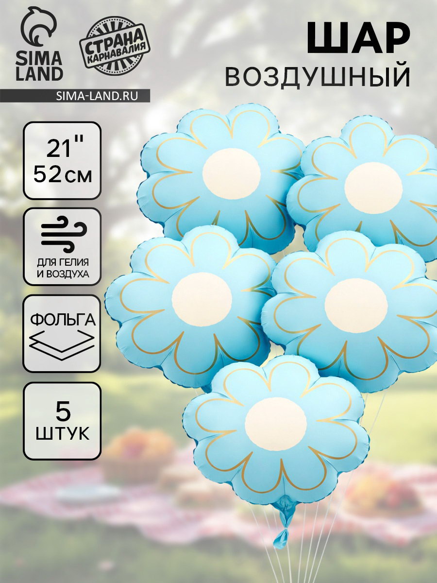 Воздушный шар фольгированный 21""Ромашка. Золотые лепестки", набор 5 шт., голубой сатин, 53x53x0.1 см., Страна Карнавалия, Китай