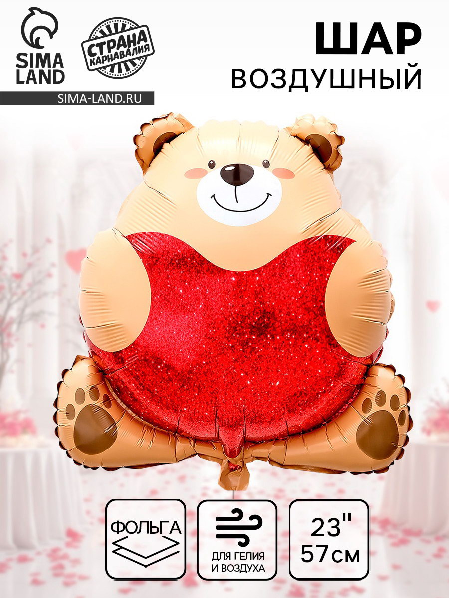 Надувка шара: Воздухом, Гелием Цвет: Бежевый, Красный Размер упаковки: 13 x 0.5 x 20 см. tnved: 9503010000 Адресат: Без адресата Наличие клапана: Да Набор: Нет Вид шара: Фигура Тематика рисунка: Любовь Оттенок: Глянец Рисунок: Да Индивидуальная упаковка: Нет Диаметр, дюйм: 23 Фольгированный шар "Медведь с сердцем" это отличный выбор для украшения дома, ресторана на торжество. Благодаря своему дизайну шар будет привлекать внимание и создавать нужное настроение на празднике. Преимущества