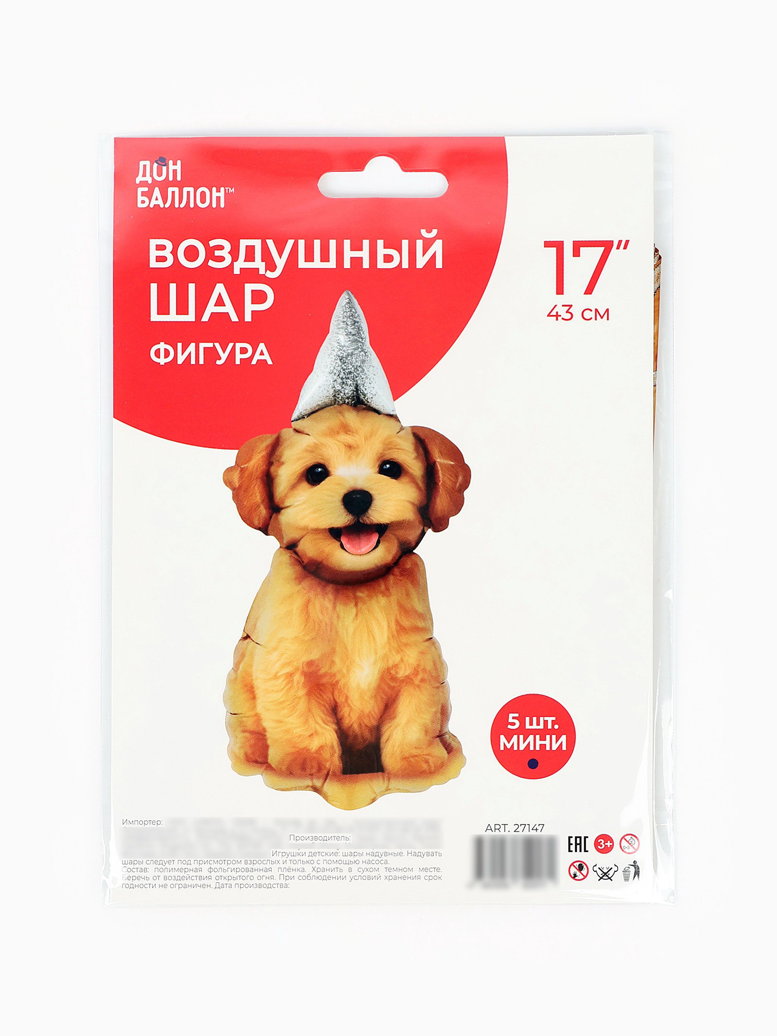 Воздушный шар фольгированный 17""Пёсик в колпачке", набор 5 шт., FALALI, Китай