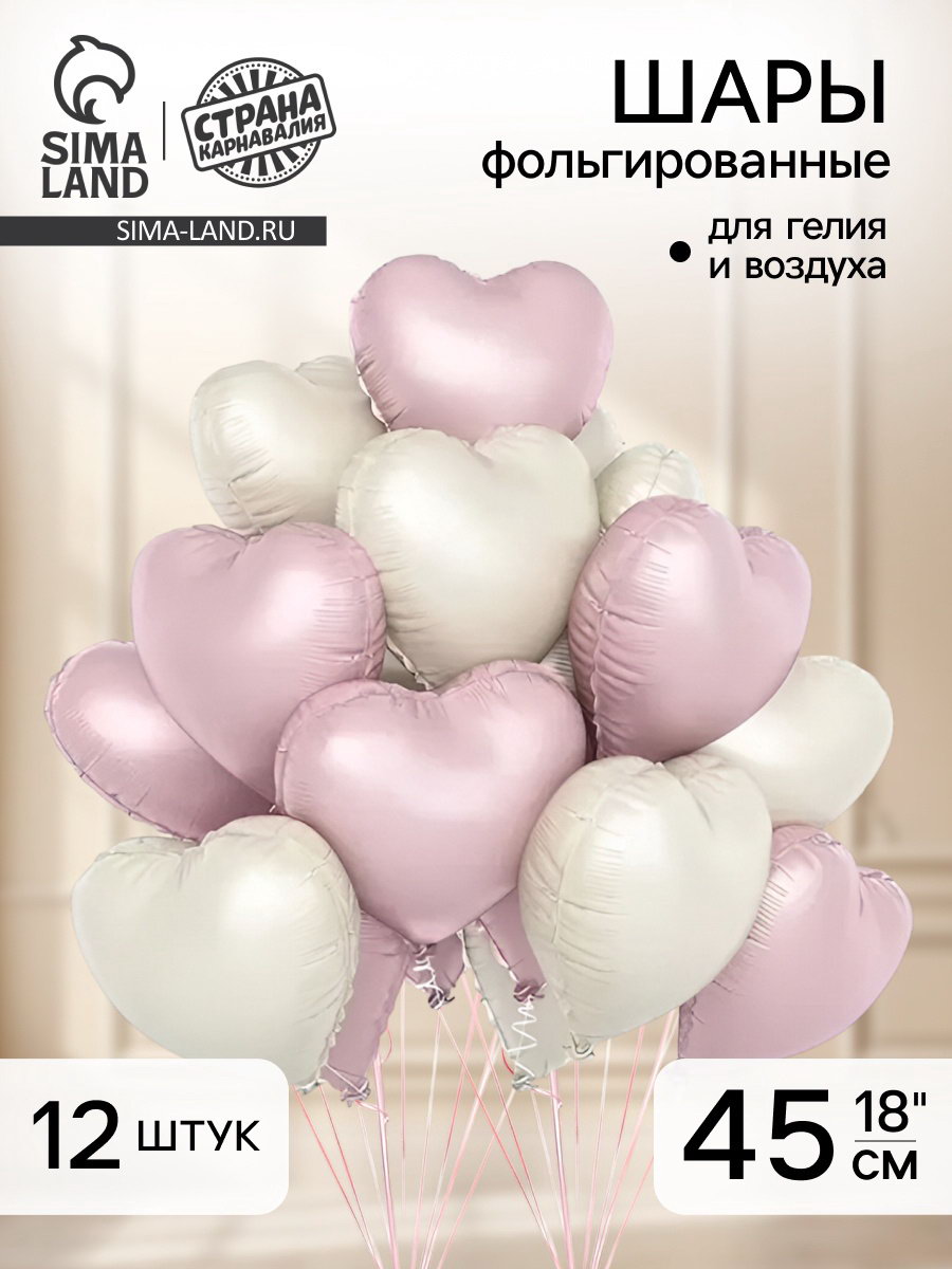 Воздушный шар фольгированный 18""Сердце", набор 12 шт., 45x45x0.1 см., Страна Карнавалия, Китай