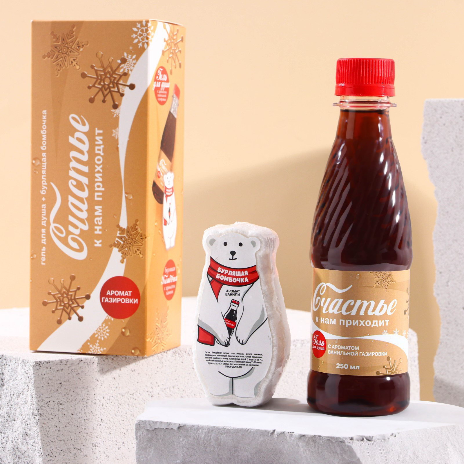 Подарочный набор косметики новогодний "Счастье к нам приходит", гель для душа 250 мл и бомбочка для ванны 100 г, Новый Год, 250 мл., Чистое счастье, Россия