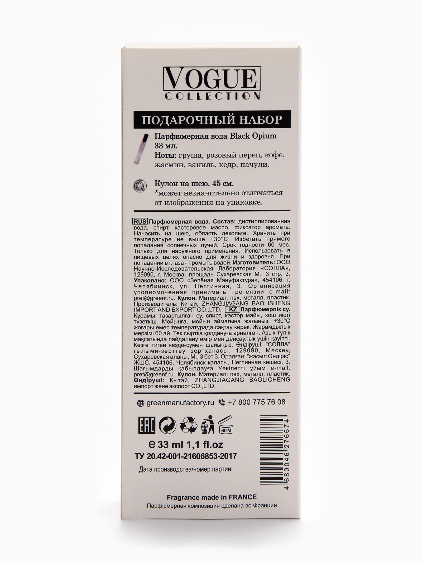 Подарочный набор косметики женский "Black Opium", кулон+парфюмерная вода, 33 мл, 33 мл., Vogue Collection, Россия