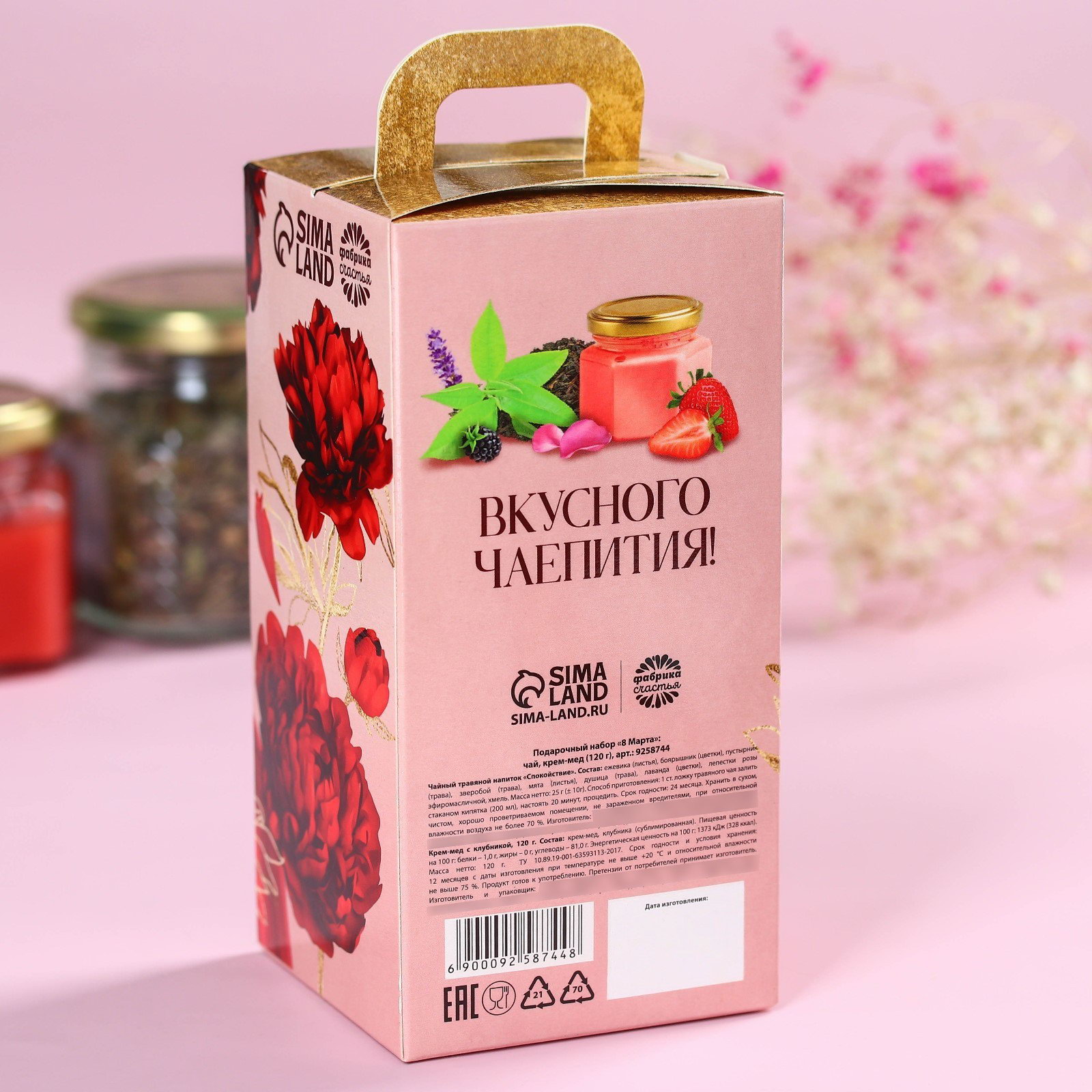 Запрет реализации по сегментам: 00000000266, 00000000593 Составляющие набора: Крем, Чай Возраст: Взрослый, Для взрослых, Подростковый Размер упаковки: 7.5 x 15.5 x 7.5 см. Темпер. ограничение НЕ ВЫШЕ ℃: +25 tnved: 409000000 Температурное ограничение: Нет Тематика праздника: 8 Марта Вид упаковки: Подарочная коробка Тематика подарка: Продукты питания Для кого: Для женщины В наборе, шт.: 2 Чайный травяной напиток "Спокойствие" Состав: ежевика (листья), боярышник (цветки), пустырник (трава), зверобой (трава), мята (листья), душица (трава), лаванда (цветки), лепестки розы эфиромасличной, хмель. Масса нетто: 25 г (± 10г). Способ приготовления: 1 ст. ложку травяного чая залить стаканом кипятка (200 мл), настоять 20 минут, процедить. Срок годности: 24 месяца. Крем-мёд с клубникой Состав: крем-мёд, клубника (сублимированная). Масса нетто: 120 гр Срок годности и условия хранения: 12 месяцев с даты изготовления при температуре не выше +20 ℃ и относительной влажности не выше 75 %. Продукт готов к употреблению. Претензии от потребителей принимает изготовитель. | ||