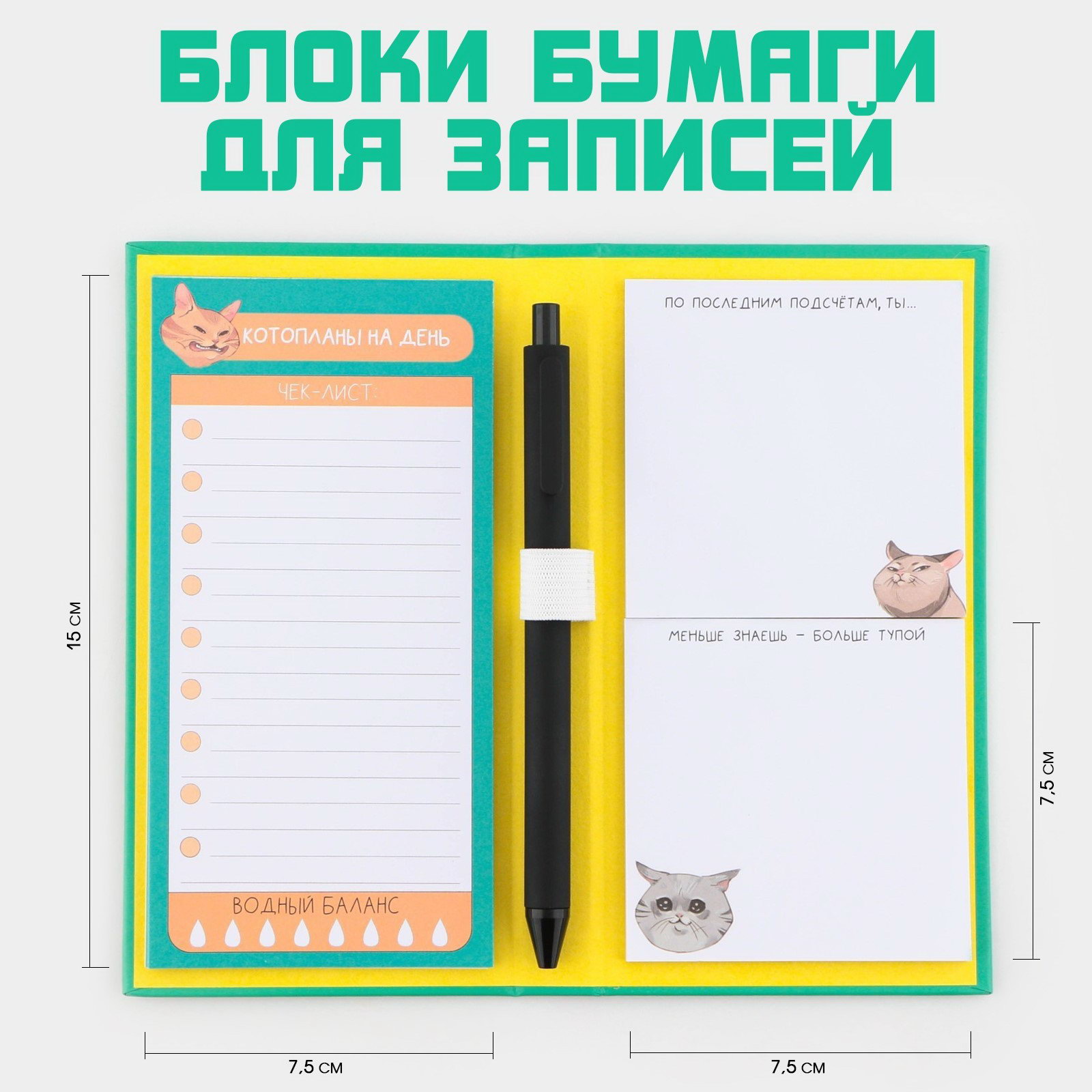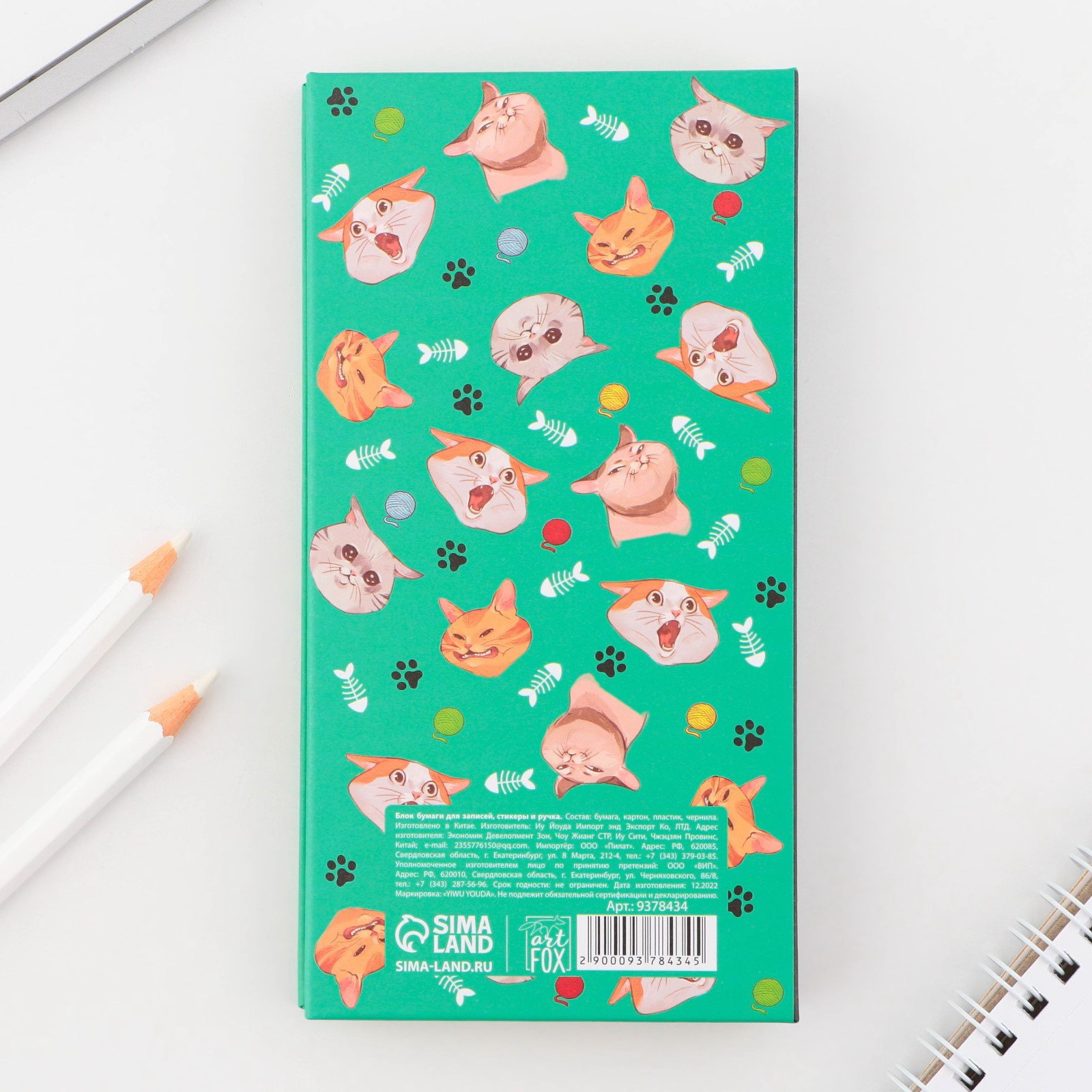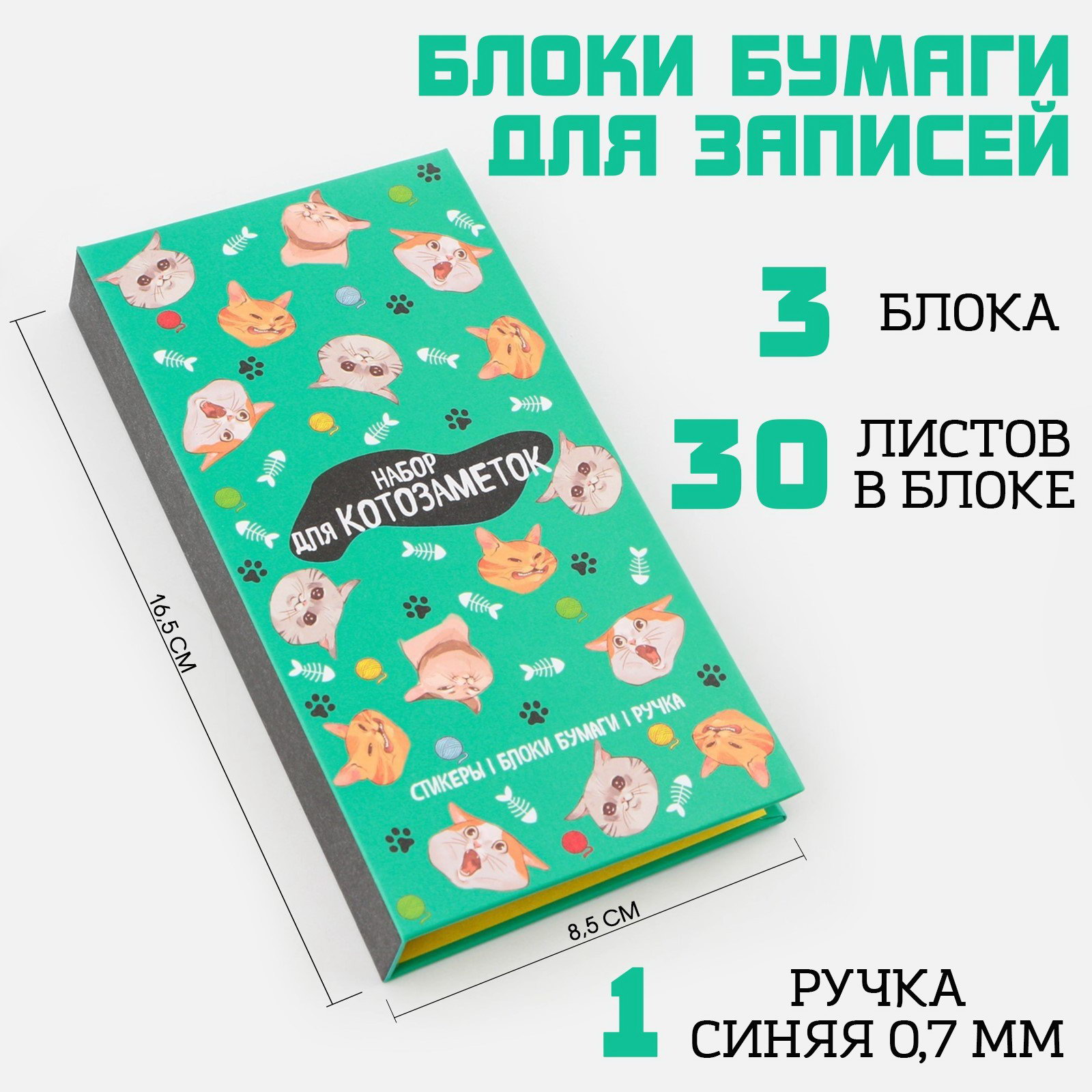 Блок бумаг для записей 3 блока по 30 листов, стикеры, ручка шариковая синяя 0.7 мм "Для котозаметок", 8.5x16.5x2 см., ArtFox, Китай