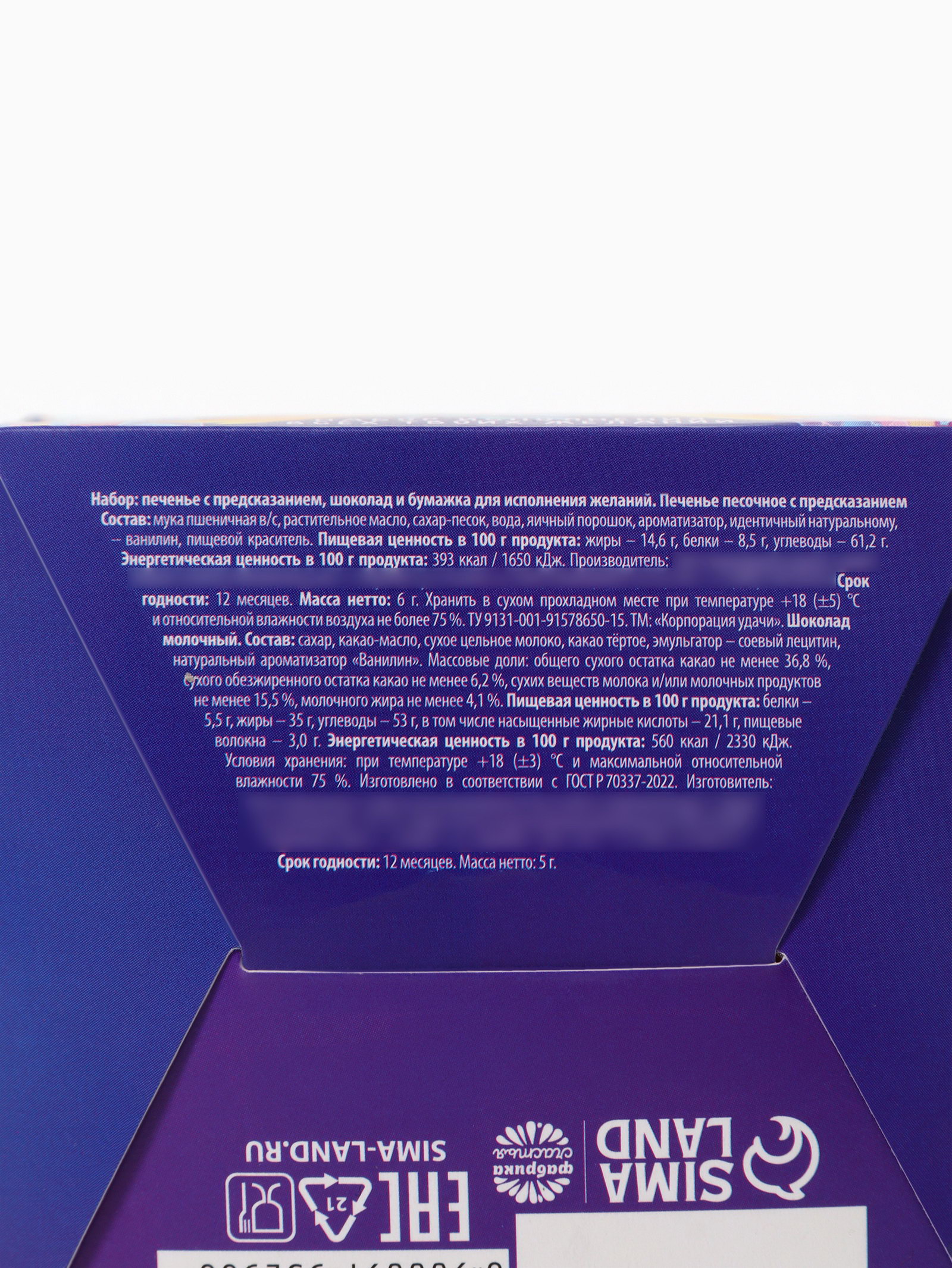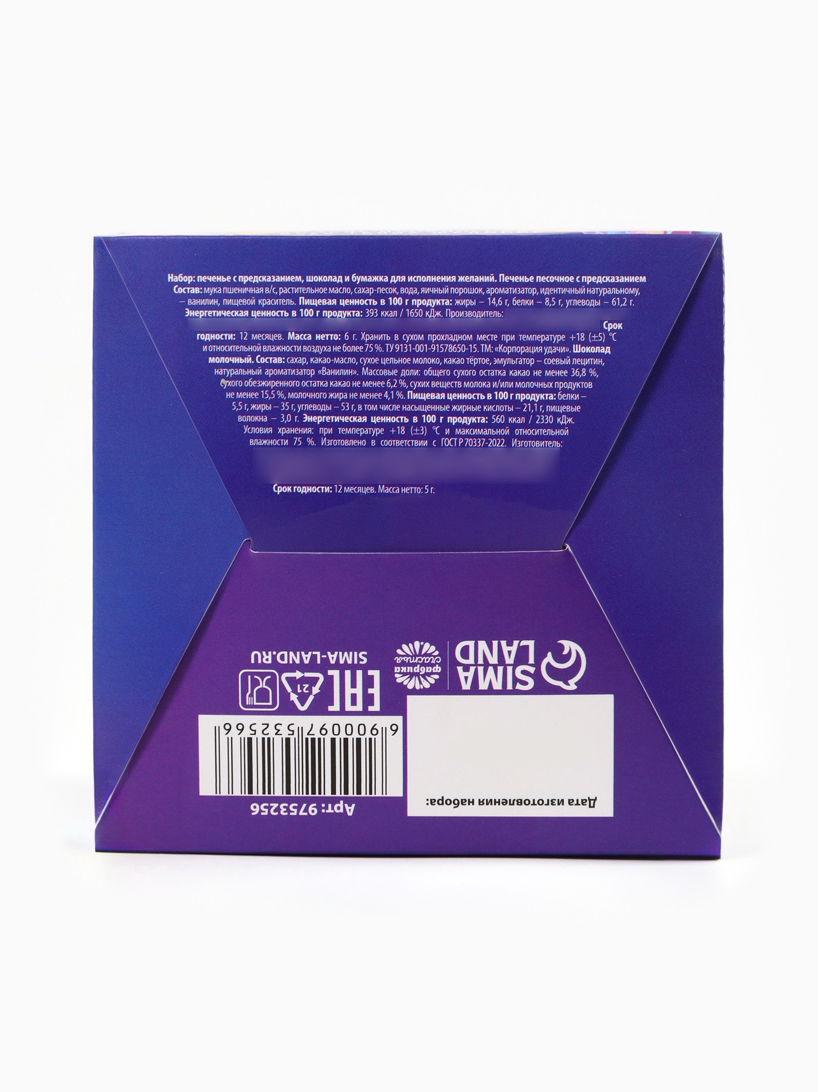 Запрет реализации по сегментам: 00000000266, 00000000593 Составляющие набора: Печенье, Шоколад Размер упаковки: 7.5 x 7 x 7.5 см. tnved: 1806321000 Символ года: Символ года 2026 (Лошадь) Набор: Да Для кого: Для женщины Адресат: Без адресата Вид упаковки: Подарочная коробка Тематика праздника: Новый год Тематика подарка: Продукты питания В наборе, шт.: 3 Возраст: Для детей Новогодняя коллекция: Сказочный новый год Вес нетто, г: 5 ПРИ ОФОРМЛЕНИИ ЗАКАЗА, ПРОСИМ ЗАПРАШИВАТЬ АКТУАЛЬНЫЕ СРОКИ ГОДНОСТИ У МЕНЕДЖЕРА Печенье песочное с предсказанием Состав: мука пшеничная в/с, растительное масло, сахар-песок, вода, яичный порошок, ванилин, ароматизатор, идентичный натуральному. Срок годности: 12 месяцев Масса нетто: 6 гр Молочный шоколад Состав: сахар, какао-масло, сухое цельное молоко, какао тёртое, эмульгатор- соевый лецитин, натуральный ароматизатор "Ванилин". Срок годности: 12 месяцев Масса нетто: 5 гр | ||